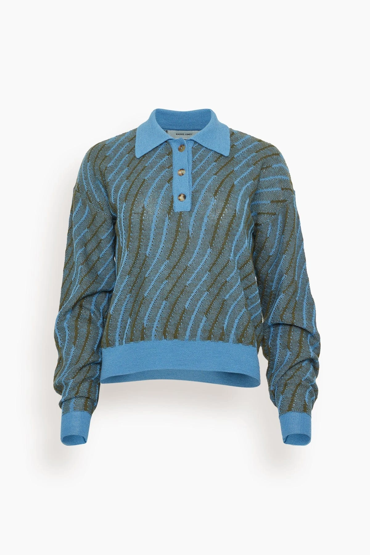 The Rachel Comey Alvar Top features the unique details you love from this designer. This sweater features a polo collar with a playful striped pattern. Wear yours with trousers and loafers.