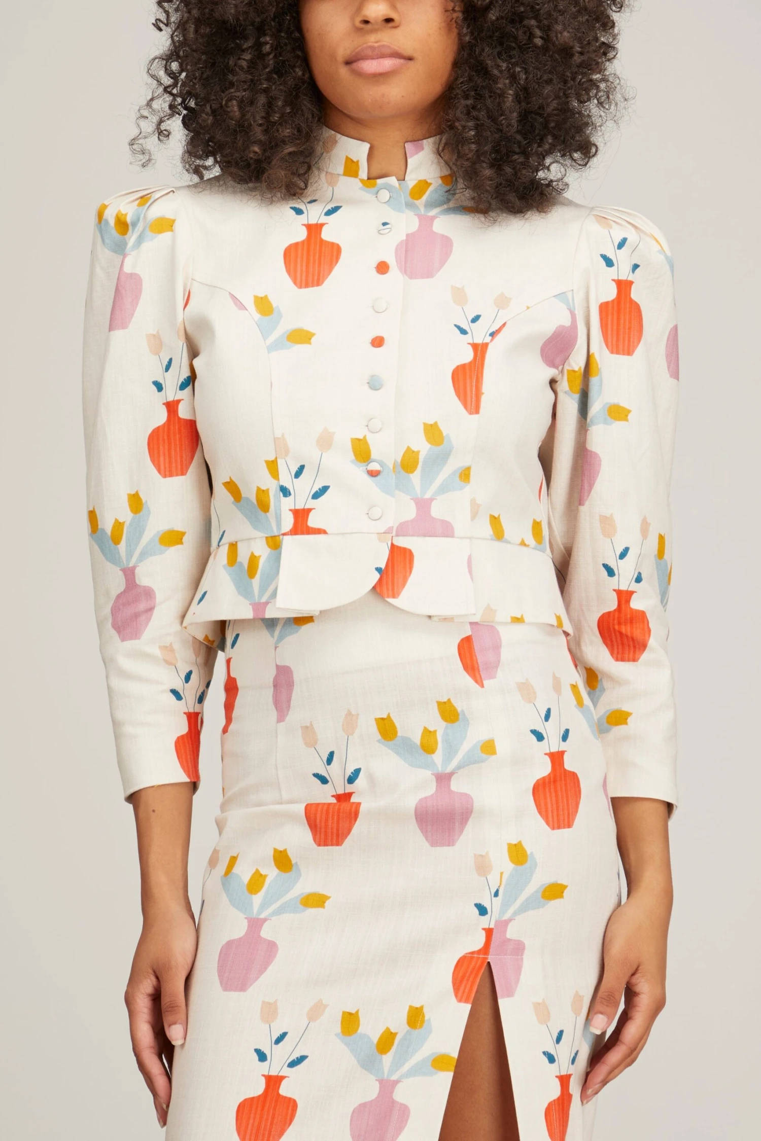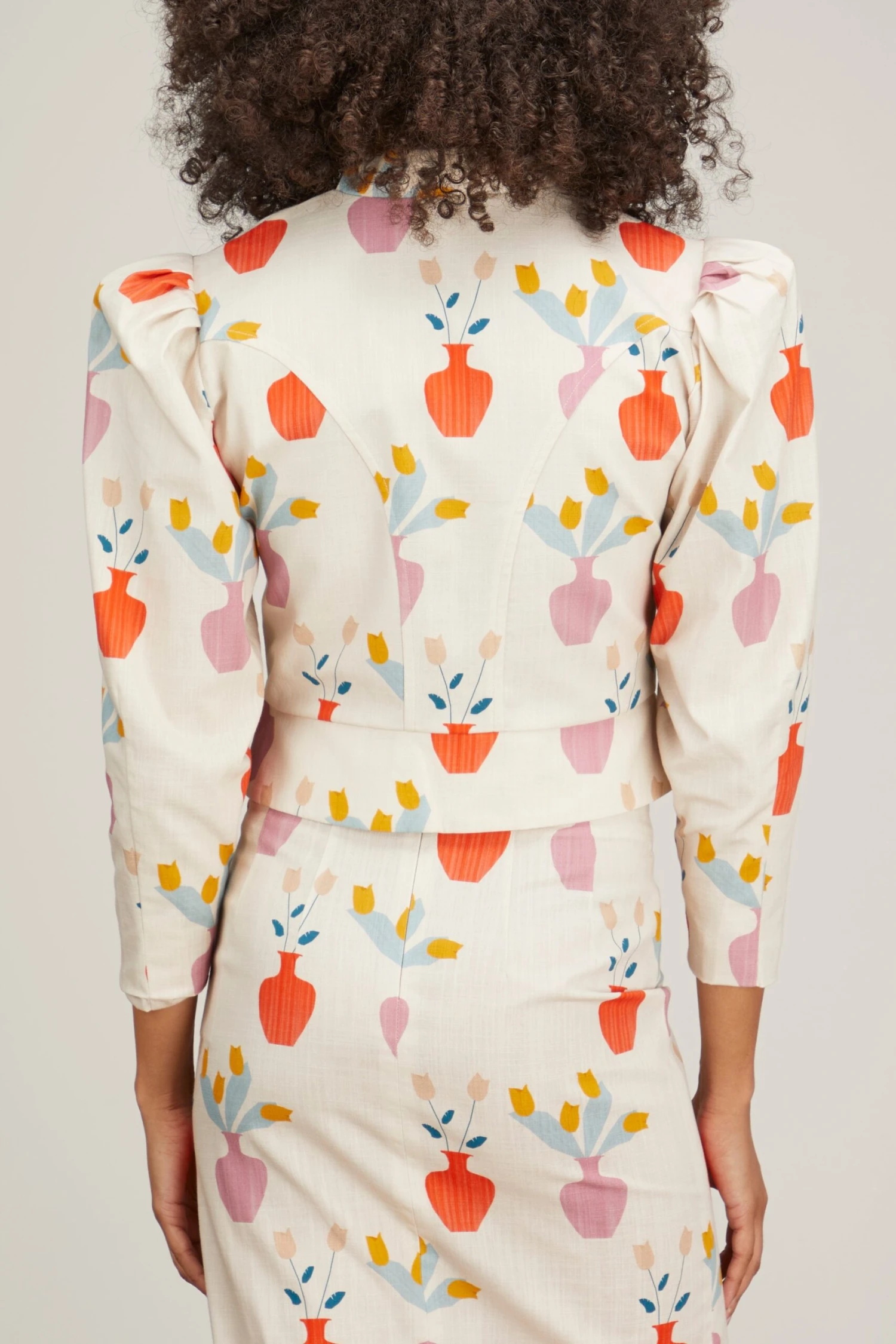 The Destree Amoako Jacket features a unique vintage silhouette you’ll love. This jacket has structural puffed sleeves with a mao collar and cinched waistband. Wear yours with high rise trousers.