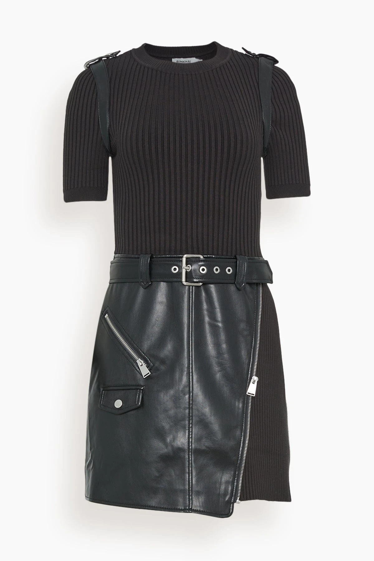 The Simkhai Anisa Belted Mini Dress in black combines a ribbed knit top and vegan leather skirt with gunmetal hardware. We love it paired with heels and a clutch.