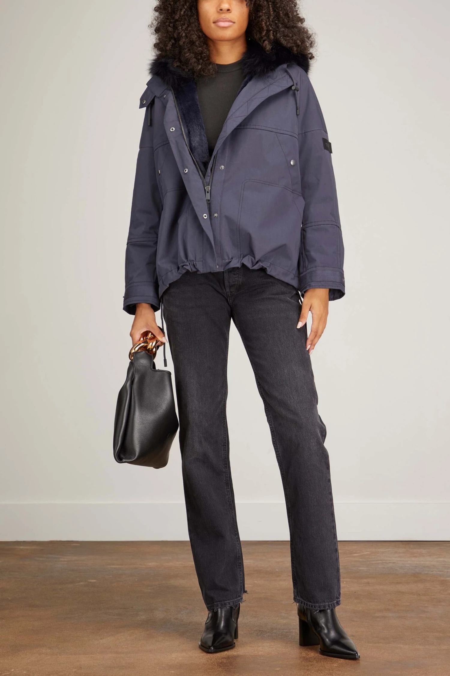 The Yves Salomon Bachette Jacket is a great addition to your fall and winter wardrobe. This utility inspired jacket features a fox fur collar and rabbit lined interior that is great for a chilly day. Wear yours with trouser and your favorite sweater.