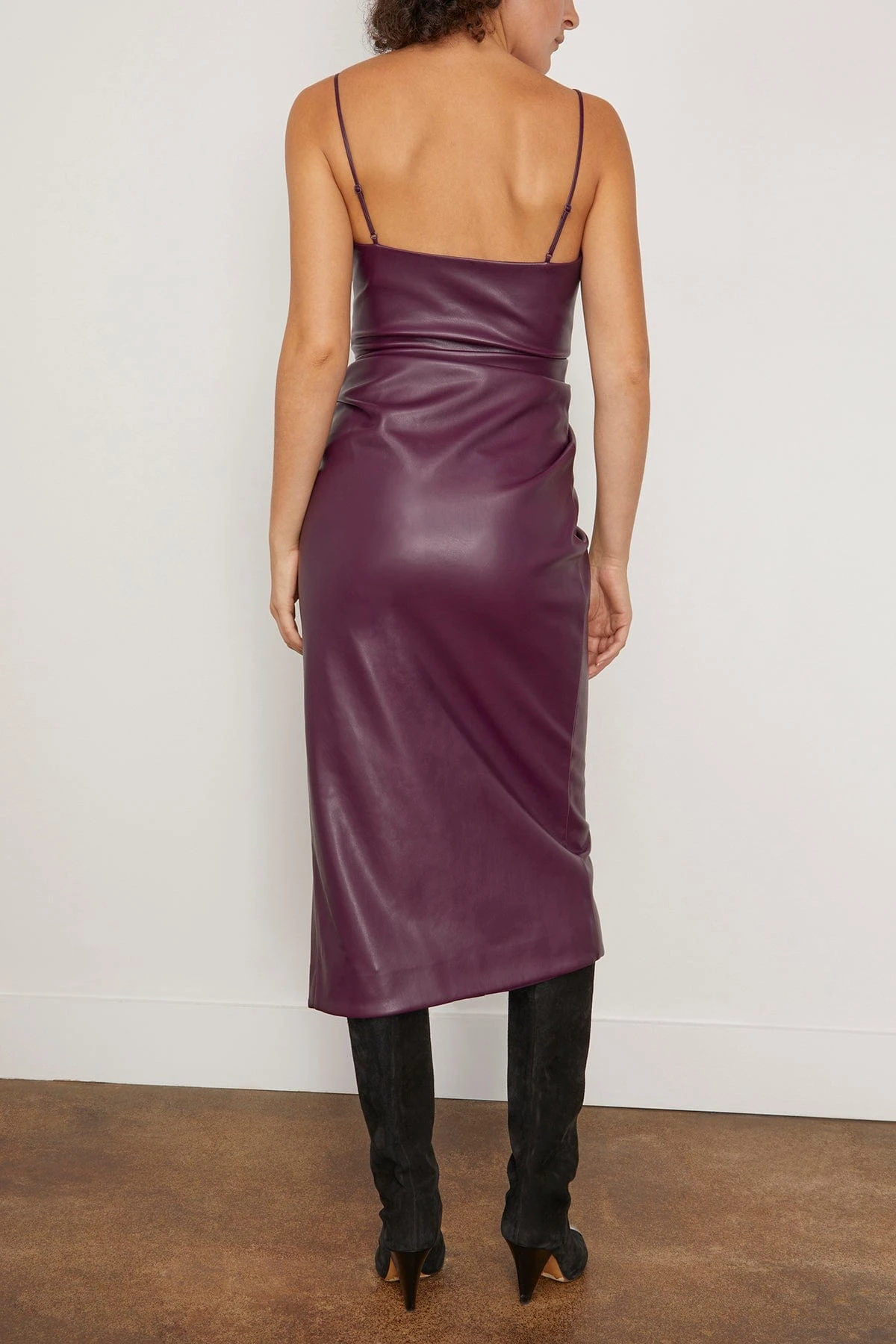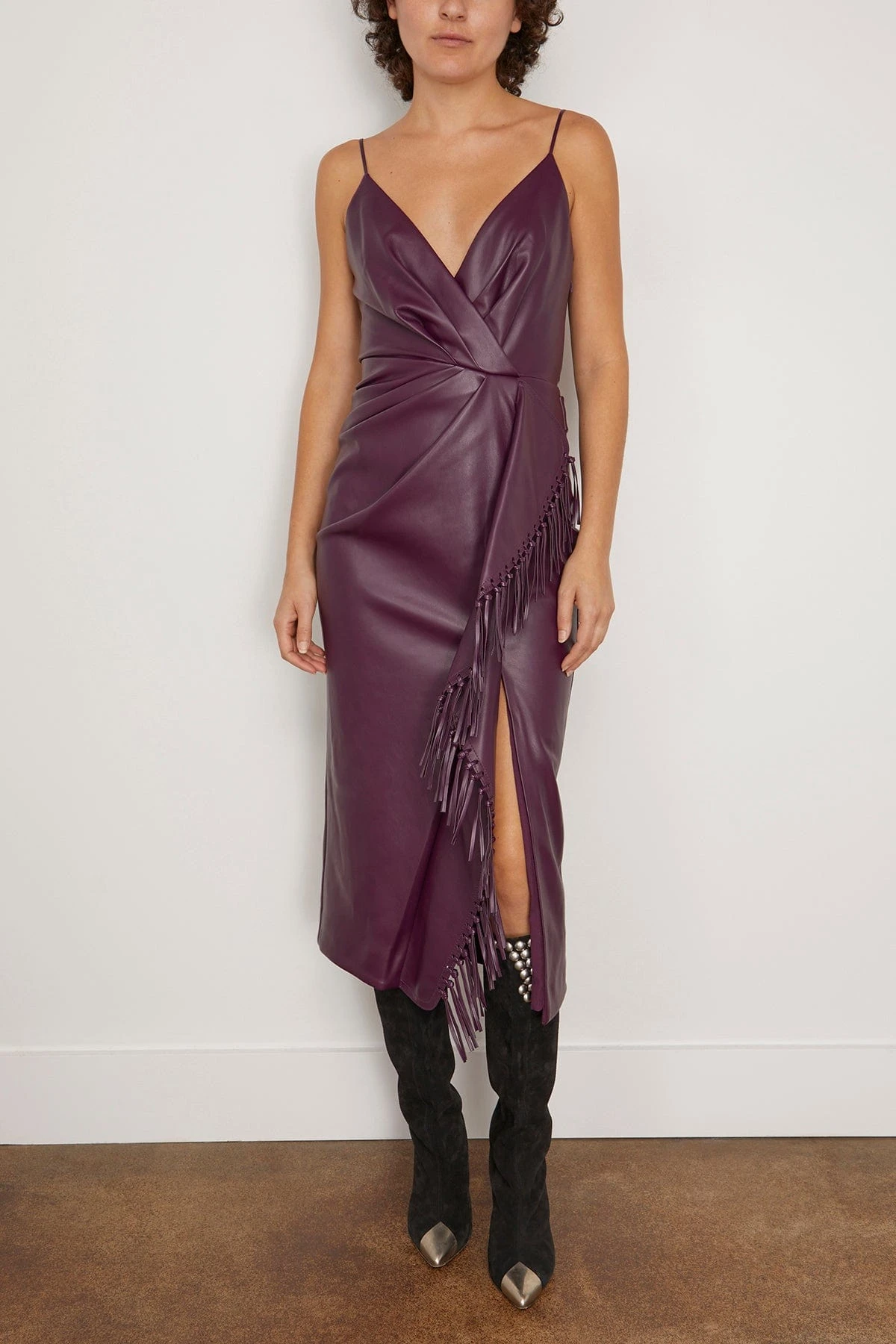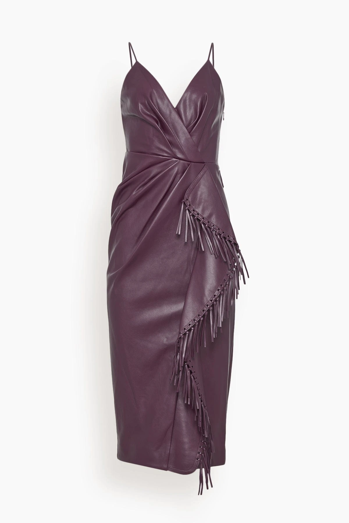 The Simkhai Carlee Fringe Midi Dress in Plum is a vegan leather dress that features a cascading drape with fringe. The plum color is a deep hue that is perfect for the upcoming season. We love it paired with heels and a clutch.