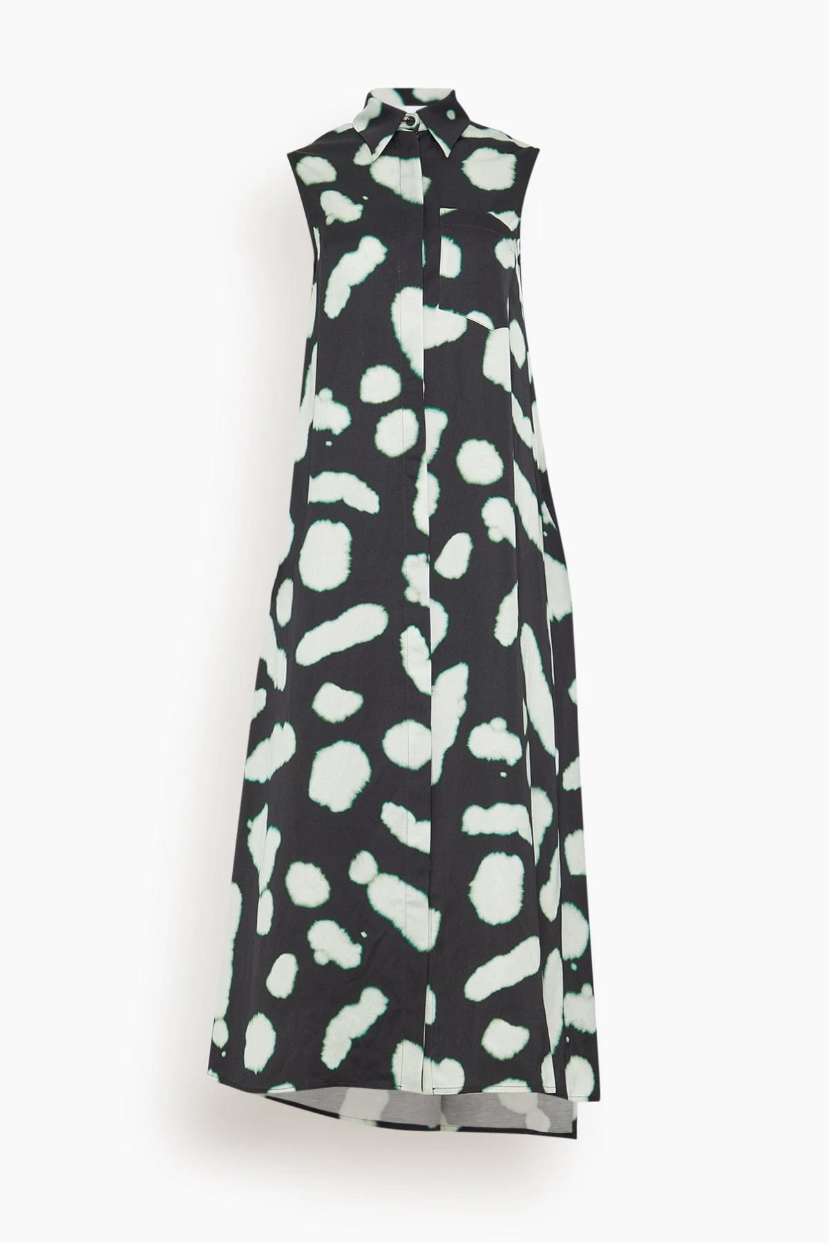 Ankle length sleeveless shirt dress with button down closure, classic collar, front pocket, side slit and draped detail in the back in printed viscose silk. This viscose silk blend is a medium-weight, absorbent, yet very strong and breathable fabric with drapey and smooth characteristics of silk.