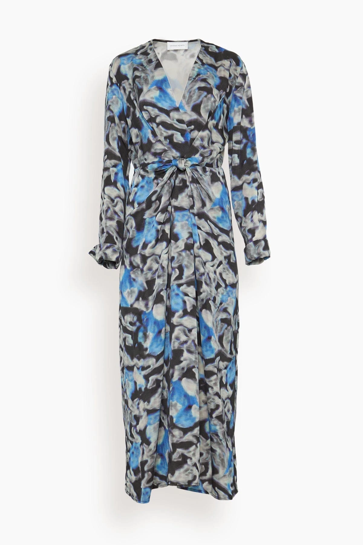 The Christian Wijnants Darkah Dress in Khirai Blue is a mid length long sleeve v-neck dress in printed heavy rayon, with gathered knot detail at the waist.