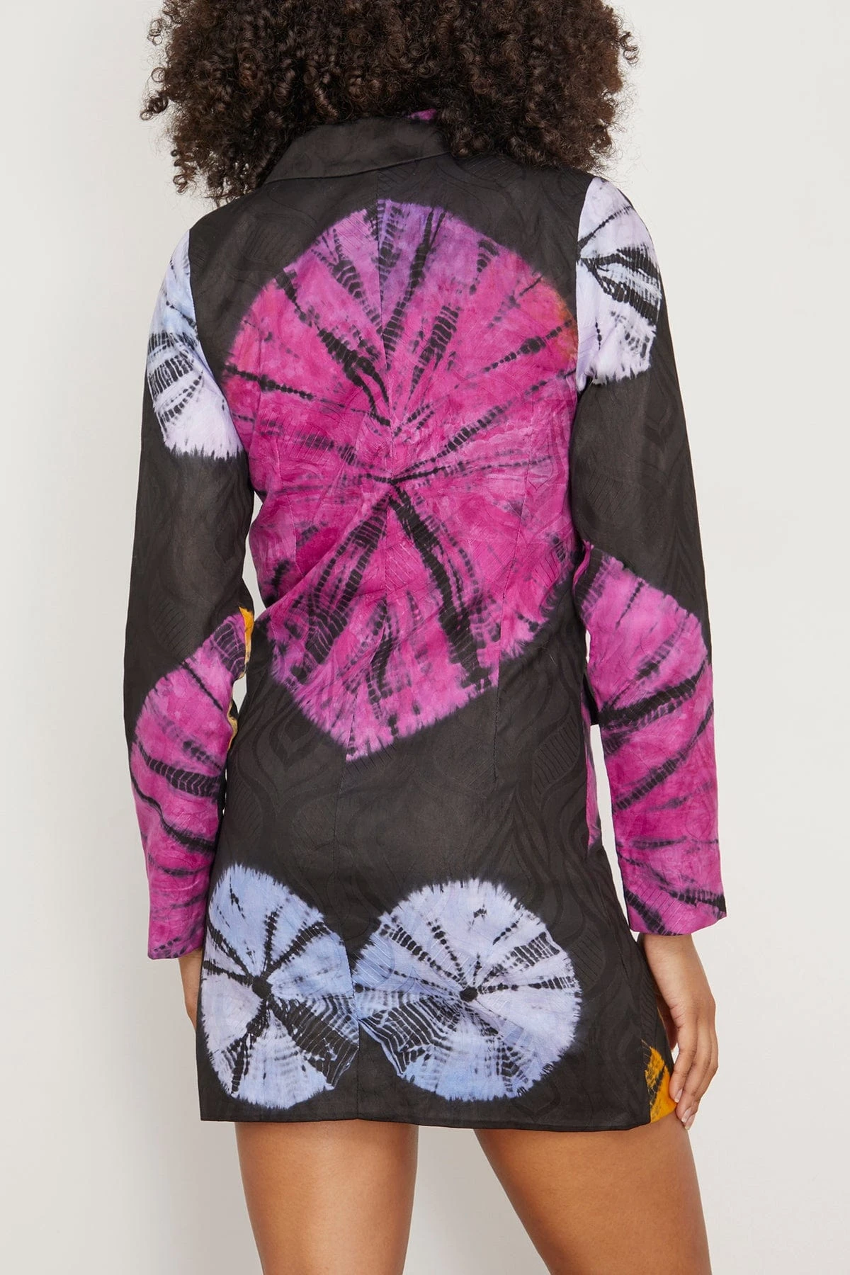 The Busayo Demi Dress in Black Multi is a hand-dyed blazer mini dress that features amulticolor pattern and beaded fringe. We love this dress paired with heels and a clutch.