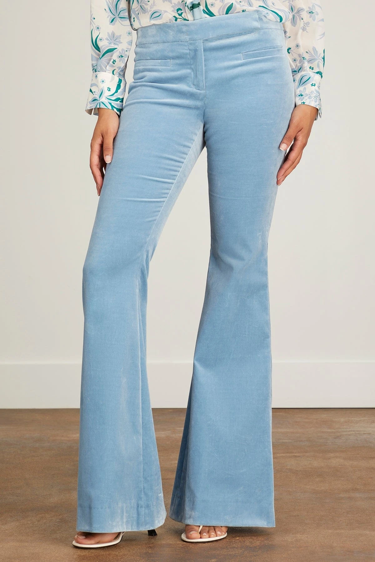 The pants are made of soft velvet. They have a flared leg and go perfectly with the matching velvet blazer.