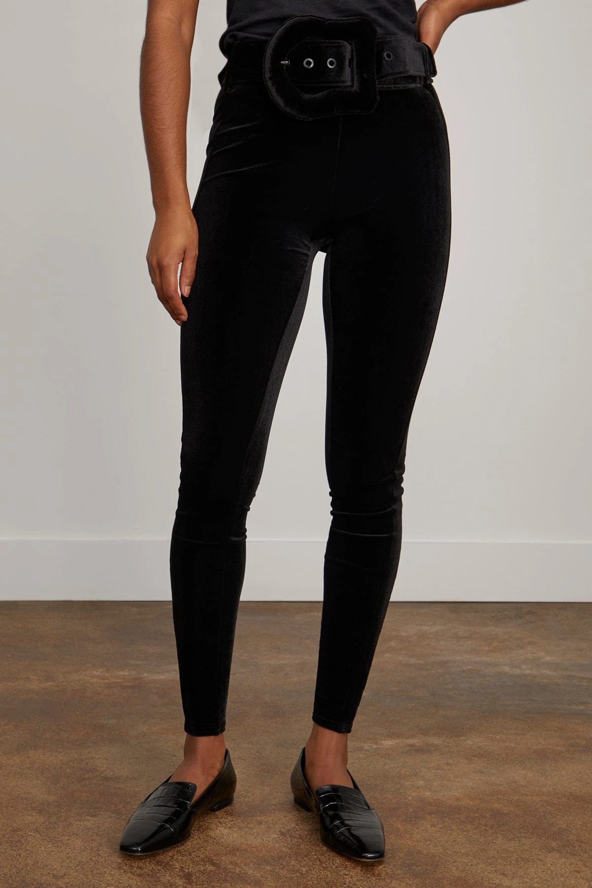 The Dorothee Schumacher Soft Elegance Pant are fitted leggings made of velvet. The added stretch makes this fitted style incredibly comfy. The integrated, wide belt has a padded velvet buckle.