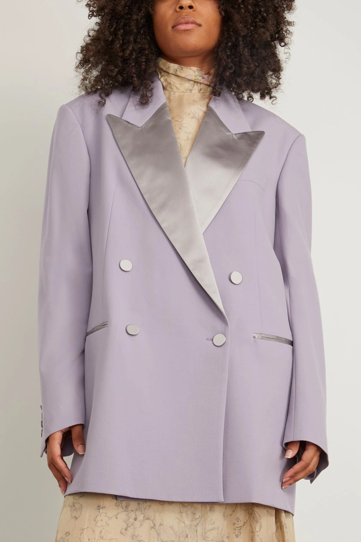 The Dries Van Noten Bliss Tuxedo Jacket in Lilac is a chic oversized jacket. We love it layered over dresses and tops. Material: 100% polyester