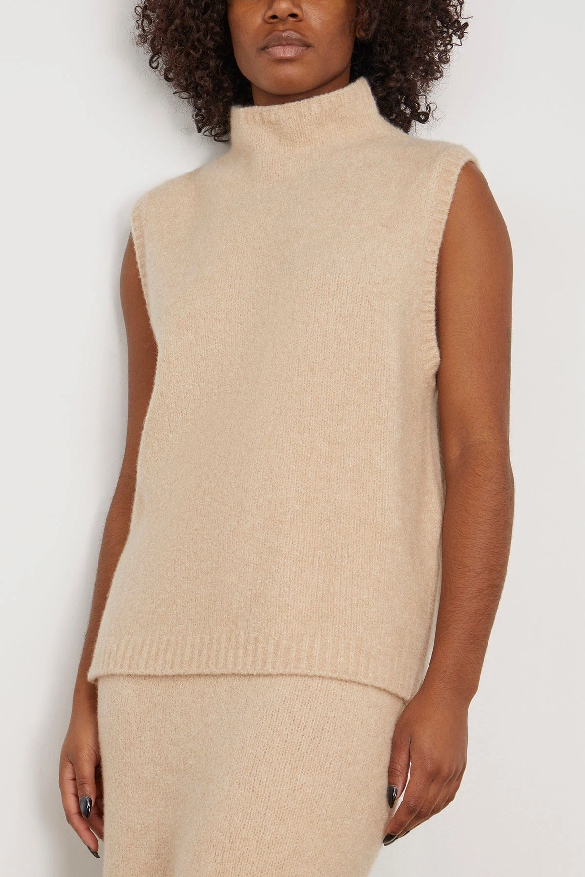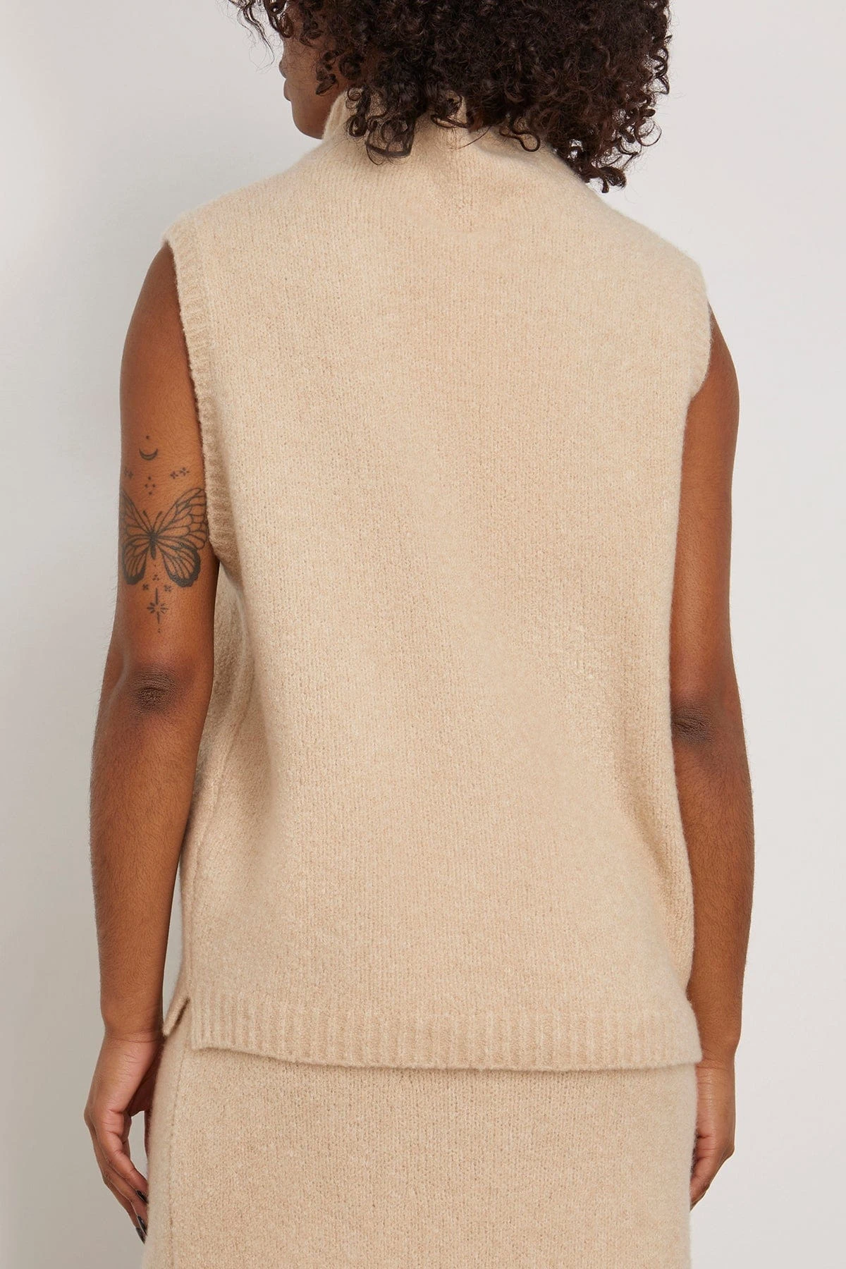 The Lisa Yang Ember Vest in Sand Boucle features a mock neckline and a subtle ribbed hem. This top is a relaxed fit that makes it perfect to layer if needed. We love wearing this vest as a top with straight leg jeans and sneakers.