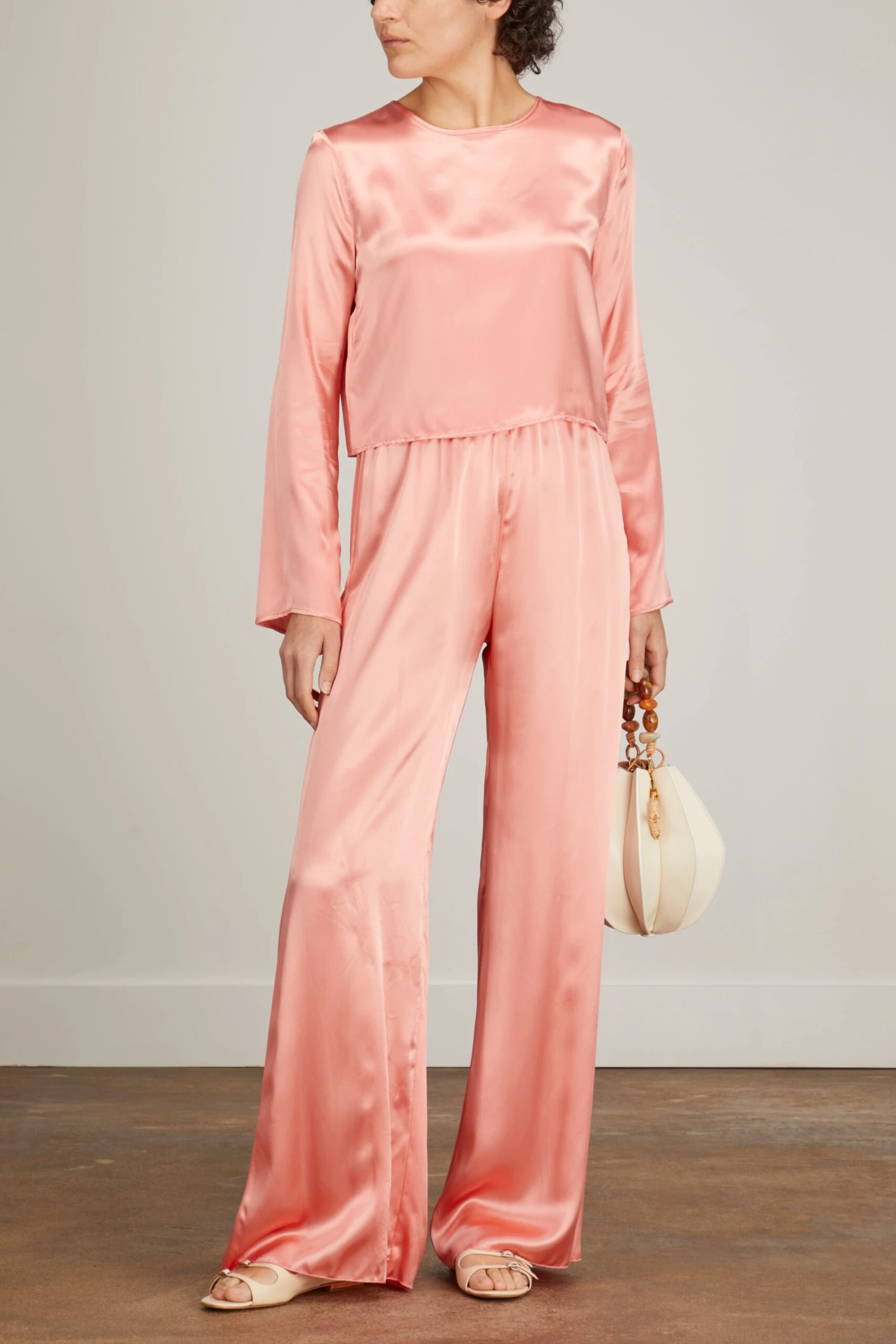 The Forte Forte Elasticated Flare Pants are a twist on a staple. These trousers are crafted in shimmering satin with a loose, wide leg and elastic waistband. Wear yours with the matching top and sandals.