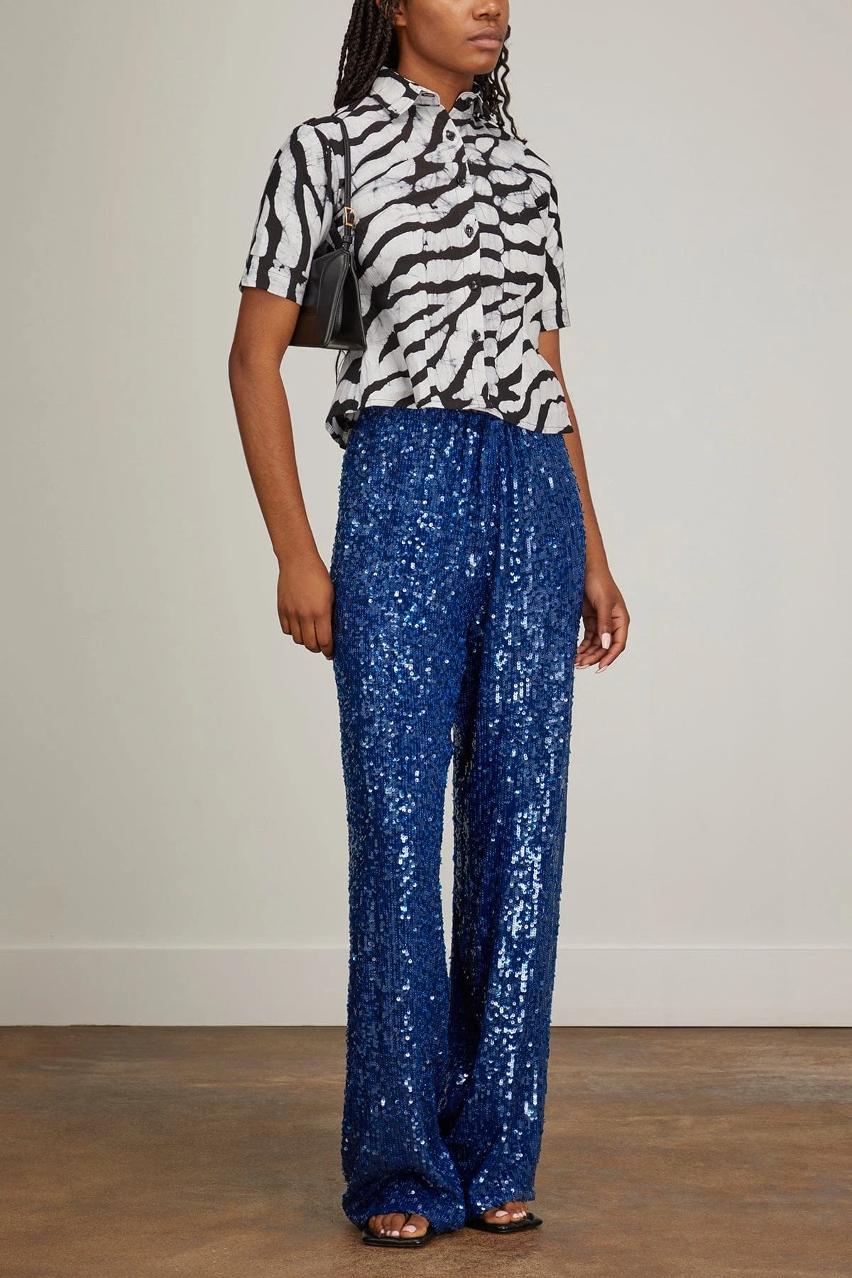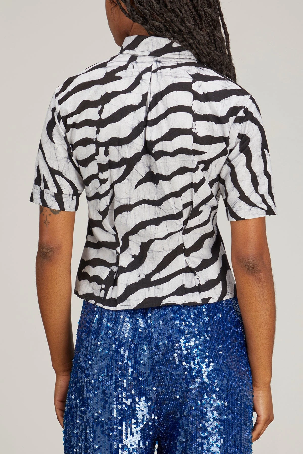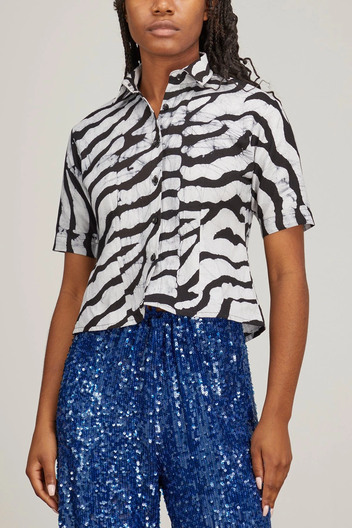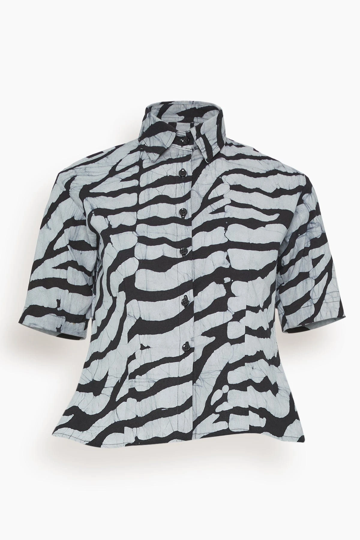 The Studio 189Hand-Batik Cotton Fitted Shirt in Black/White is a sophisticated fitted shirt crafted from a luxurious hand-batik cotton fabric, making it an exquisite addition to any wardrobe. Featuring short sleeves, a classic collar, and a flattering fitted silhouette with a flared hem, it is a timeless piece ready to be dressed up or down.