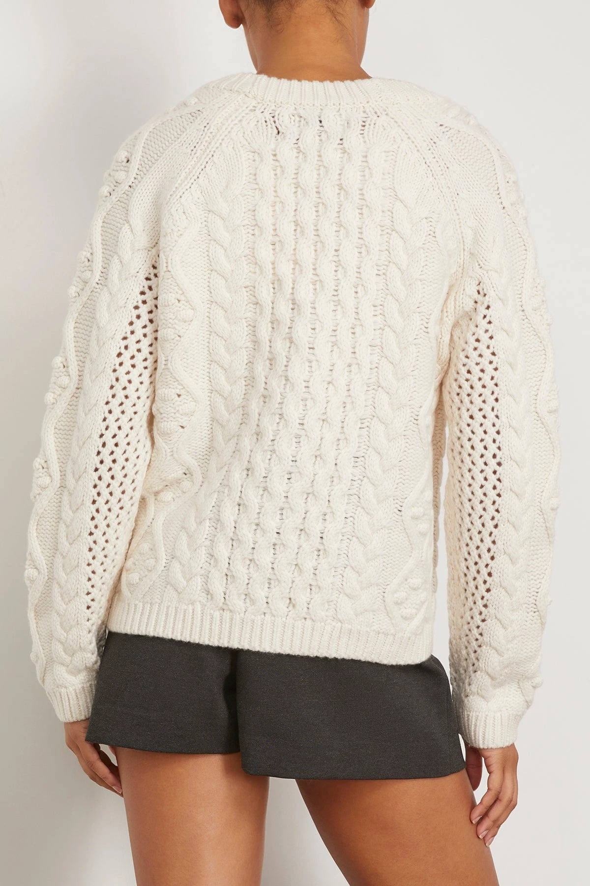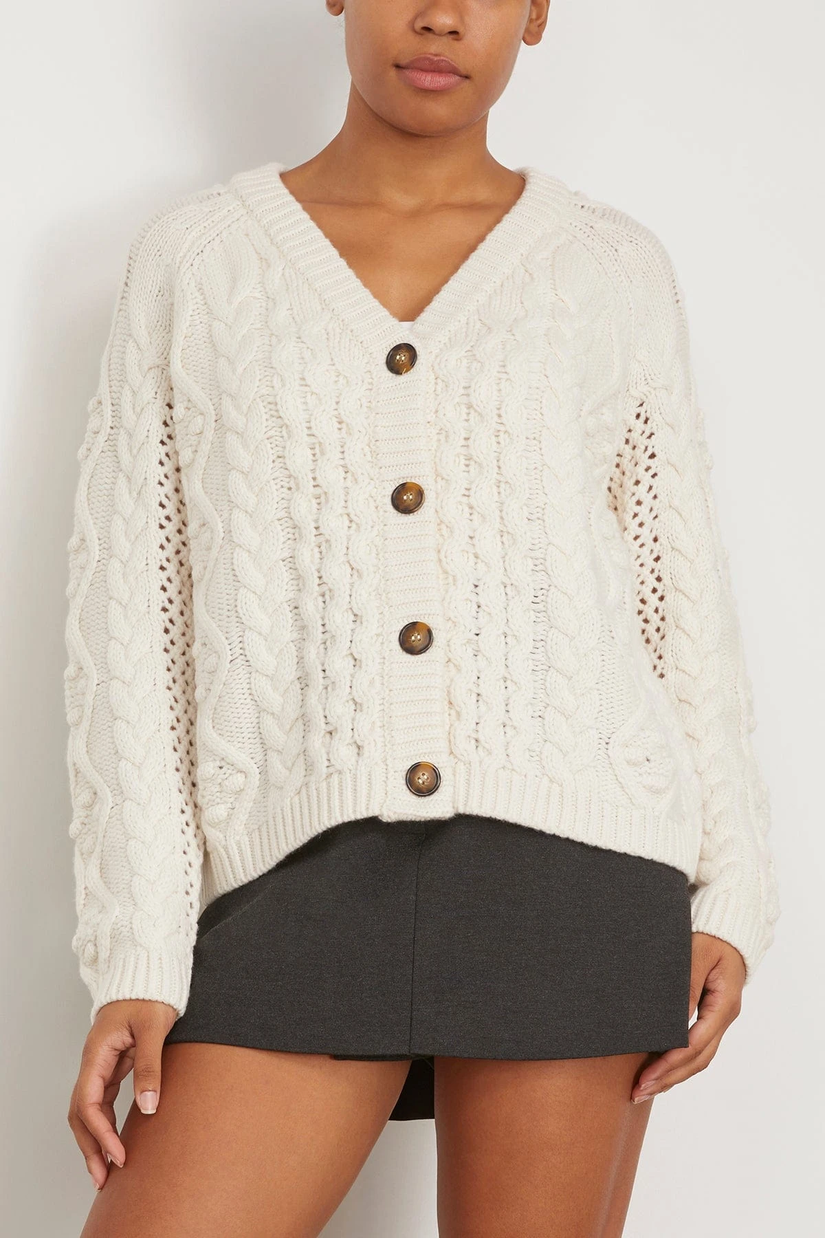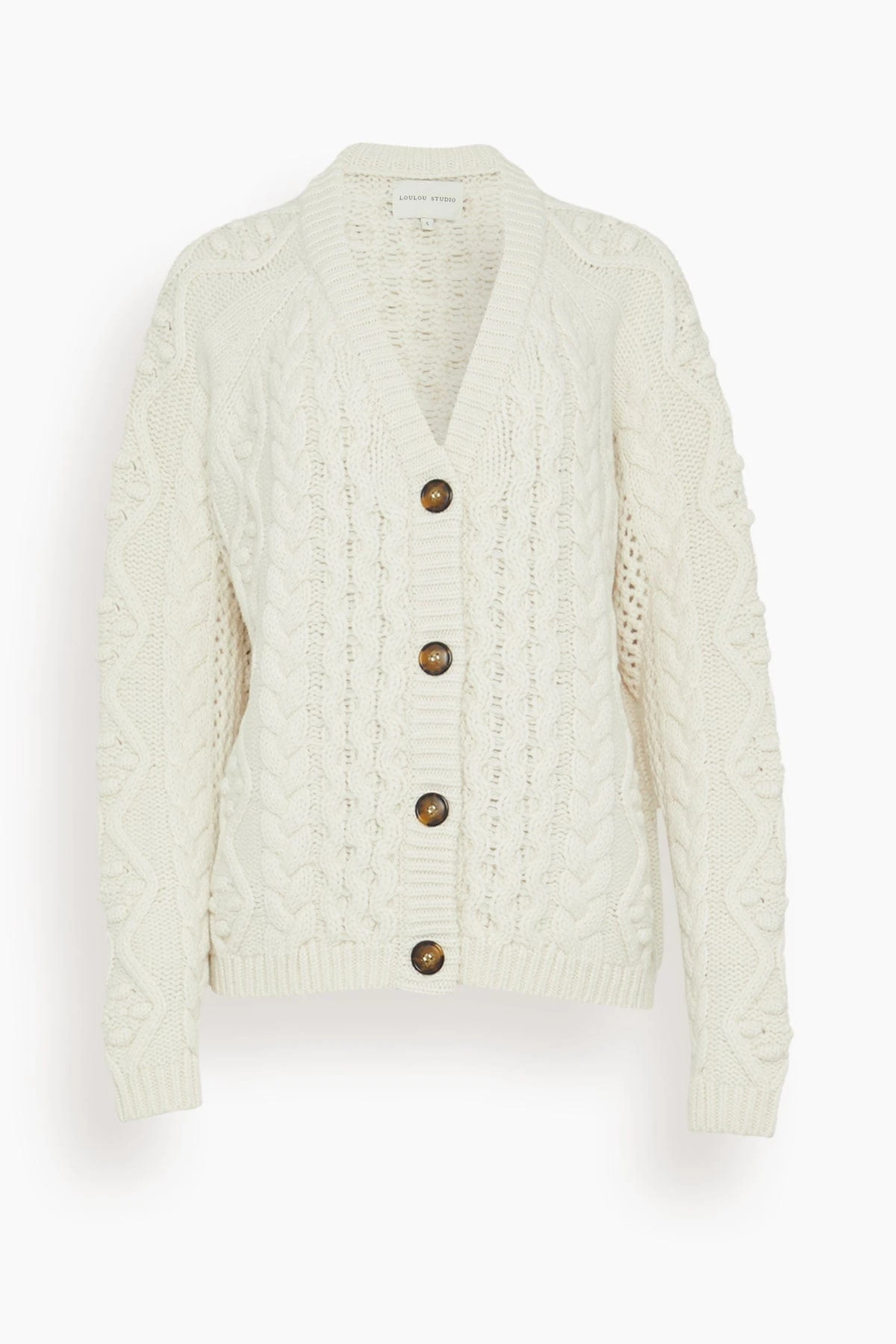 The Loulou Studio Kuma Cable Knit Cardigan in Ivory features intricate cable-knit details. This relaxed cardigan has dropped shoulders and a rib-knit trim. This cozy piece is blended with luxurious wool and cashmere. We love it paired with jeans and boots.