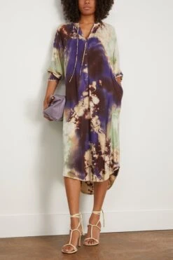 The Hannah Artwear Larisa Dress in Silk Habotai is hand dyed and printed in the Holiday 23 Sapphire Buta Print – a traditional Indian print design reimagined in the blue and ivory of the Narain Niwas Palace Hotel. A favourite in the Hannah Artwear Studio and a feminine take on the classic shirt dress. We love it paired with boots and a tote.