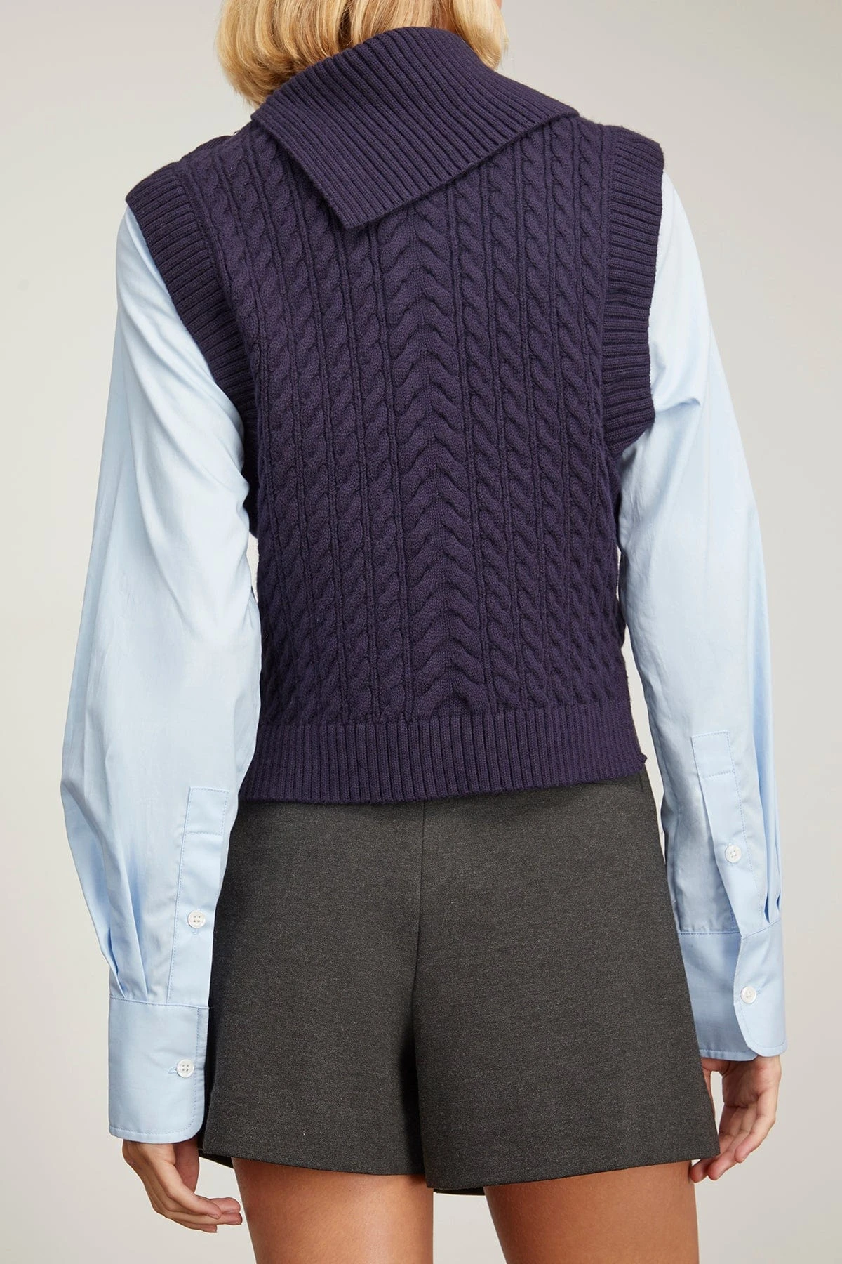 The Simkhai Linnea Long Sleeve Pullover in Glacier Multi combines shirting sleeves and a cable-knit body. We love this top with a skort and boots.