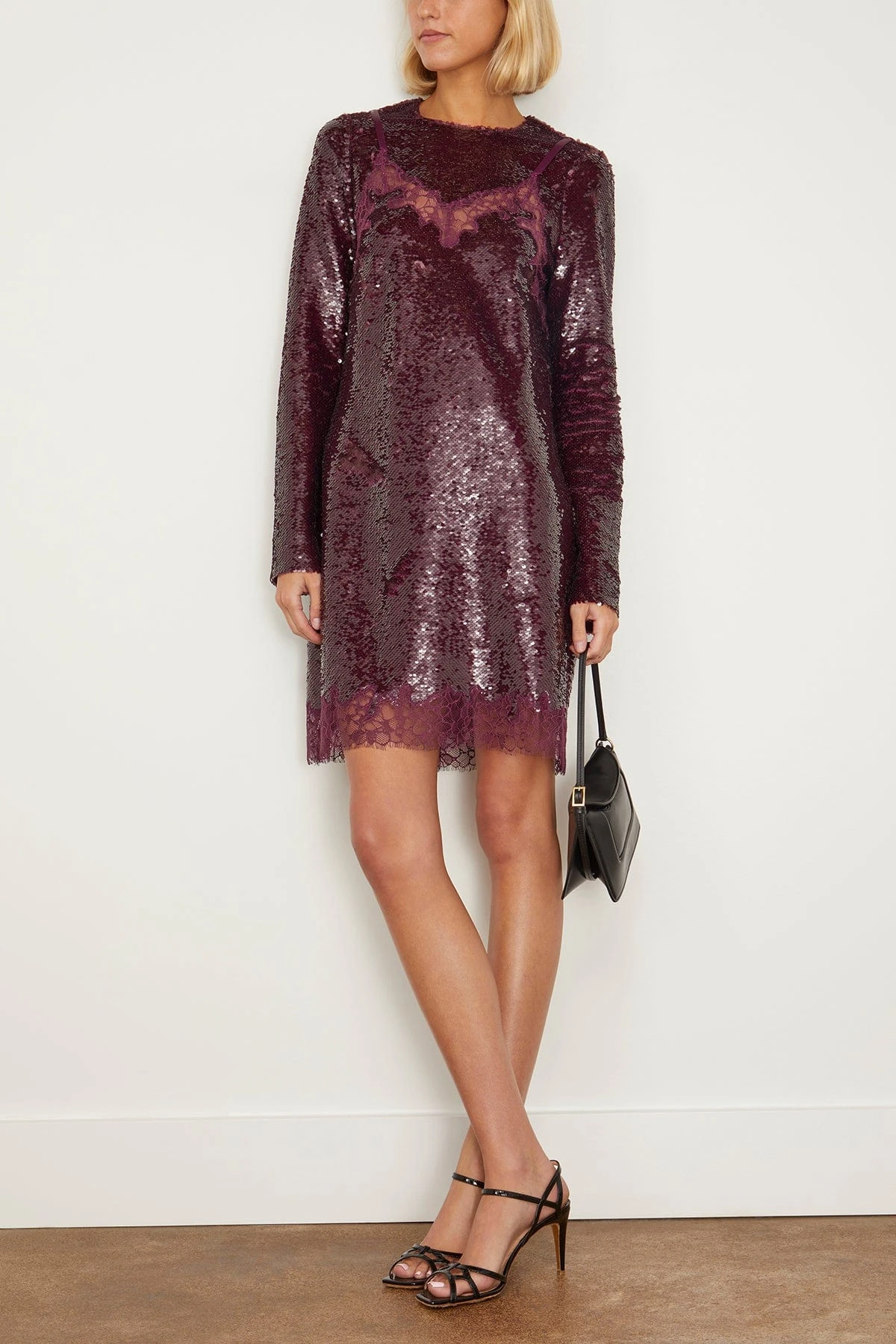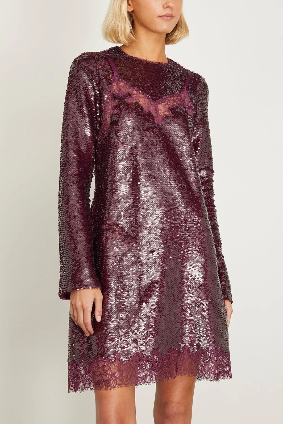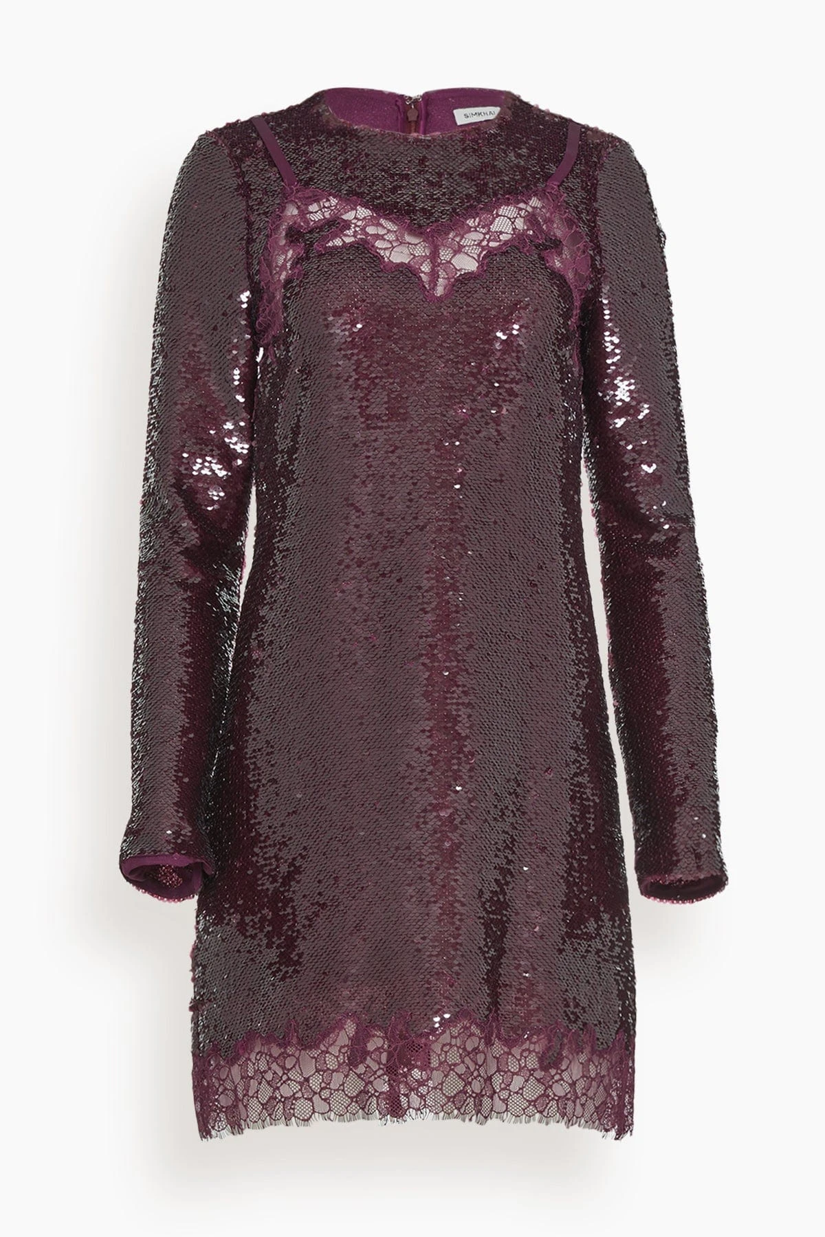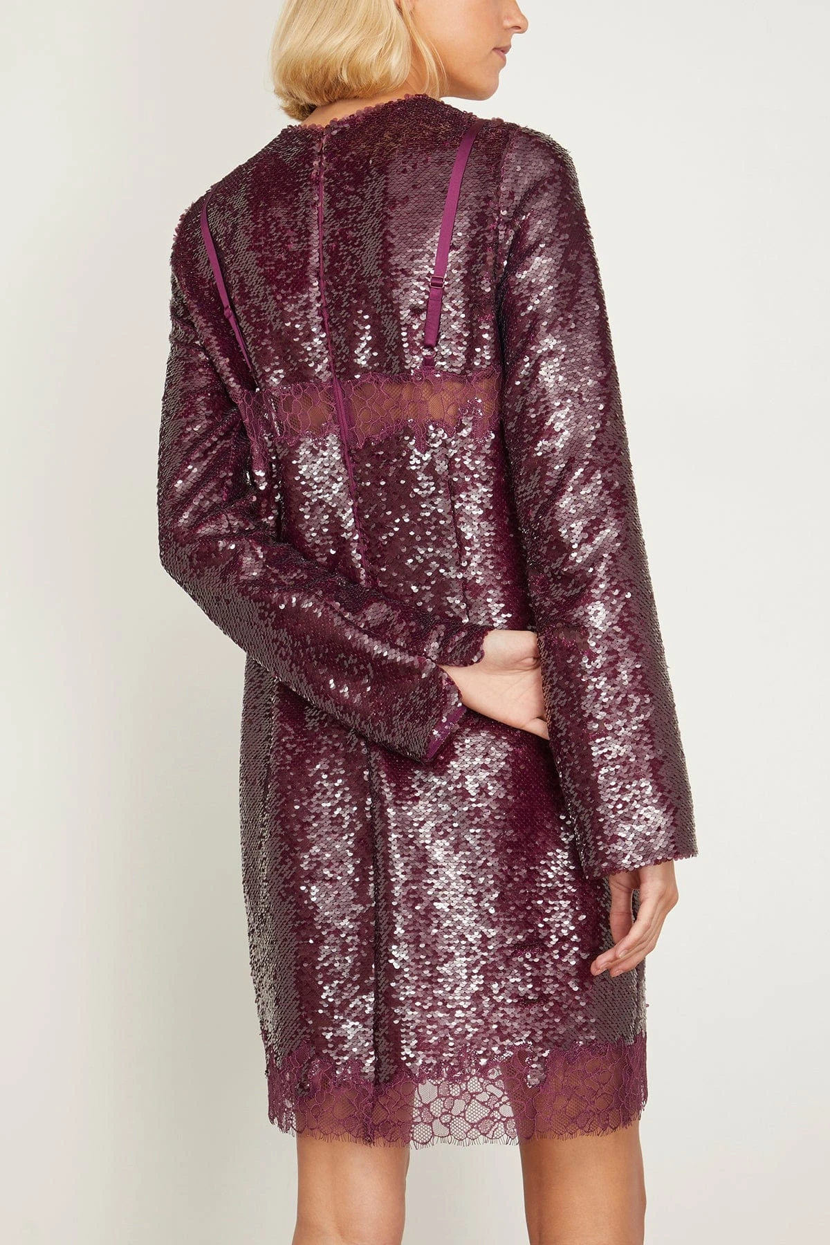 The Simkhai Mako Long Sleeve Mini Dress in Mangosteen is a sequined dress embellished with a lace bralette inset and hem. We love it with heels and a clutch.