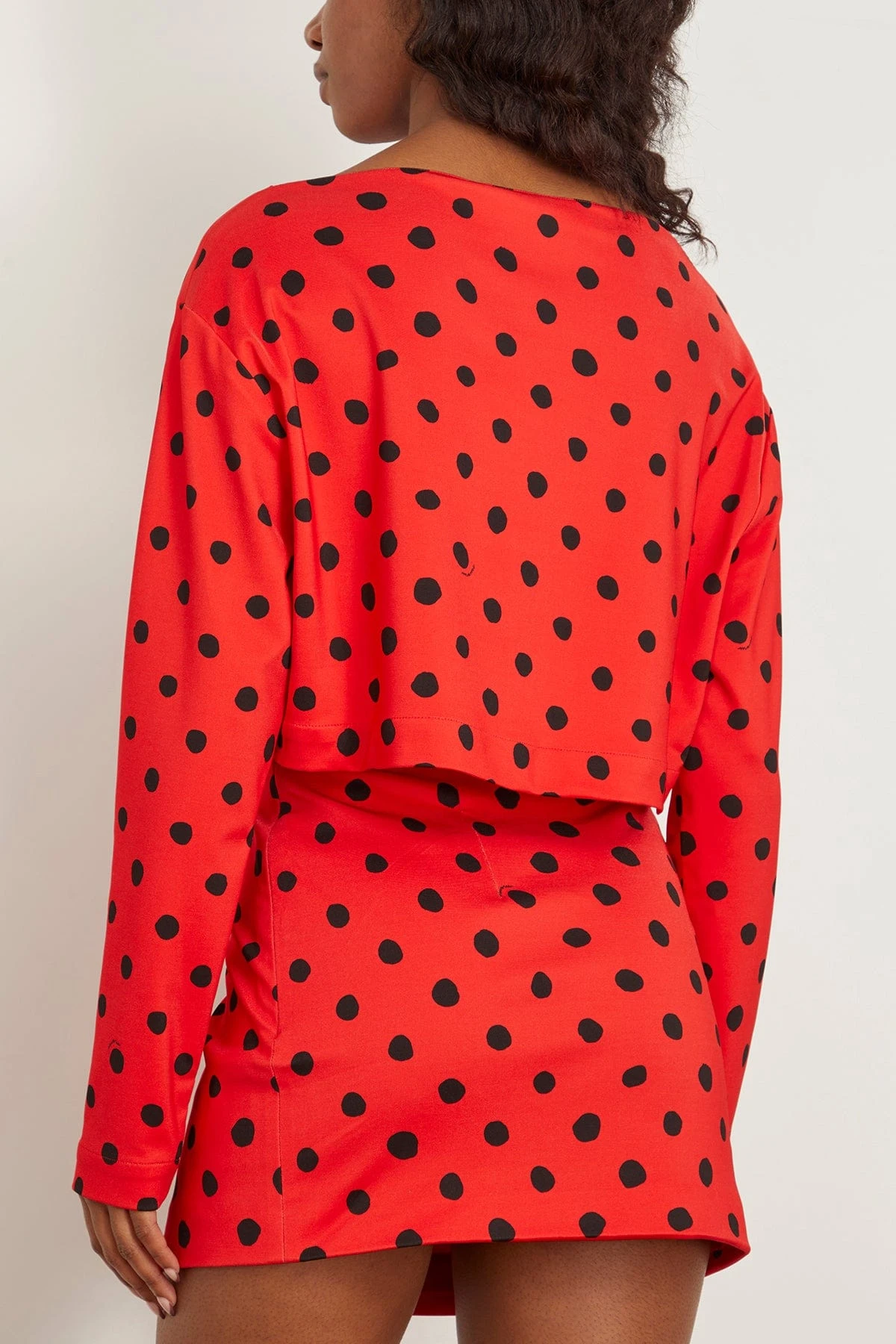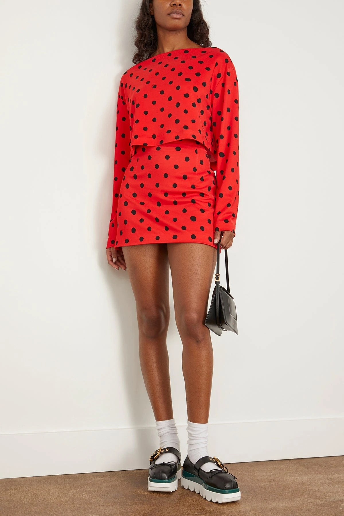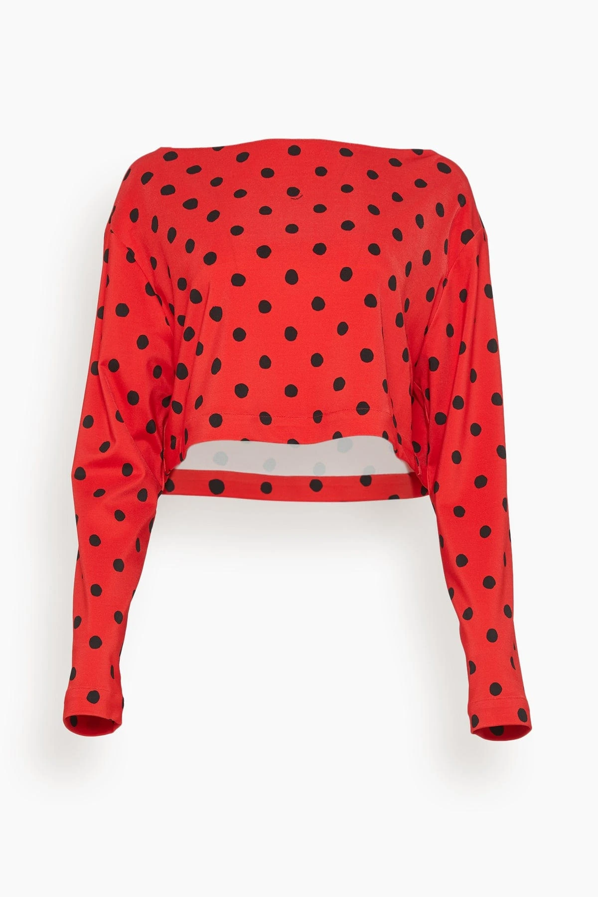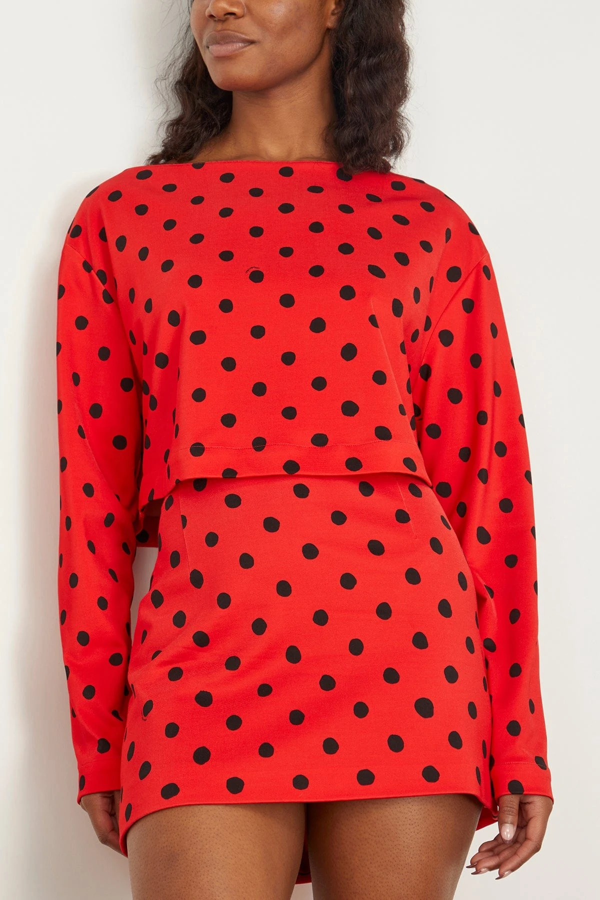 The Marni Small Dot Technical Jersey Boatneck Top in Lacquer is a jersey top that features small polka-dots printed throughout. We love the boatneck style with the matching mini skirt and boots.