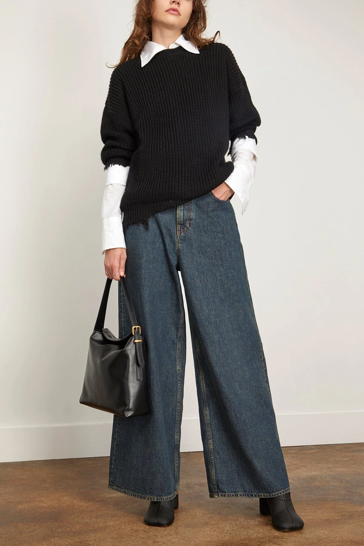 The MM6 Maison Margiela Crewneck Sweater in Black is a chunky knit sweater with cotton poplin shirt cuffs and hem. We love it paired with jeans and boots.