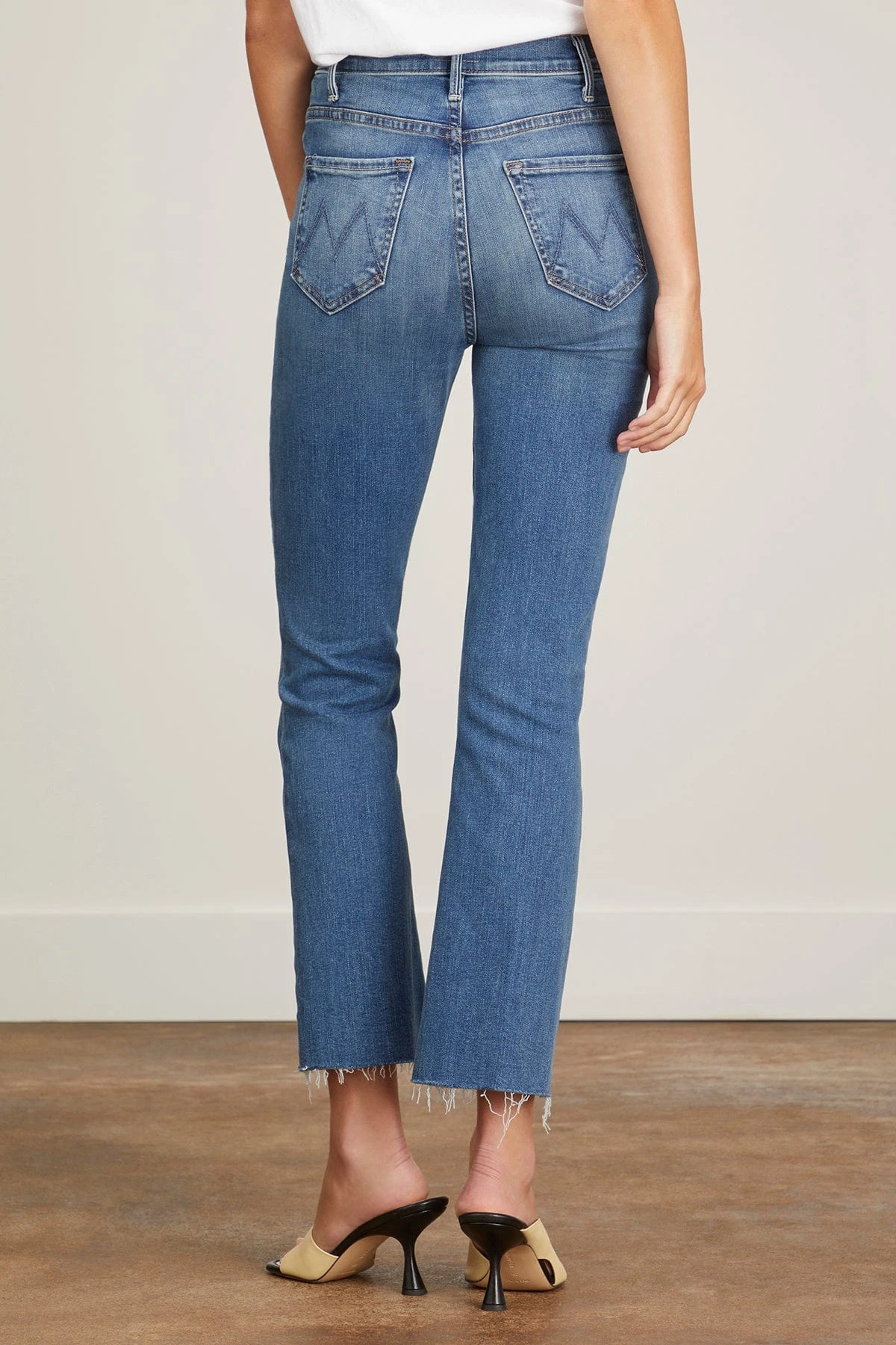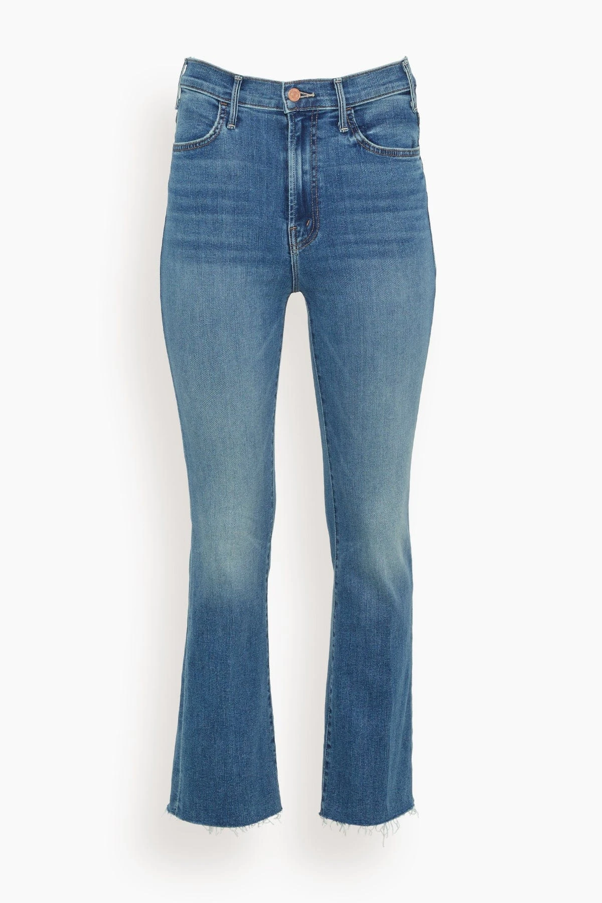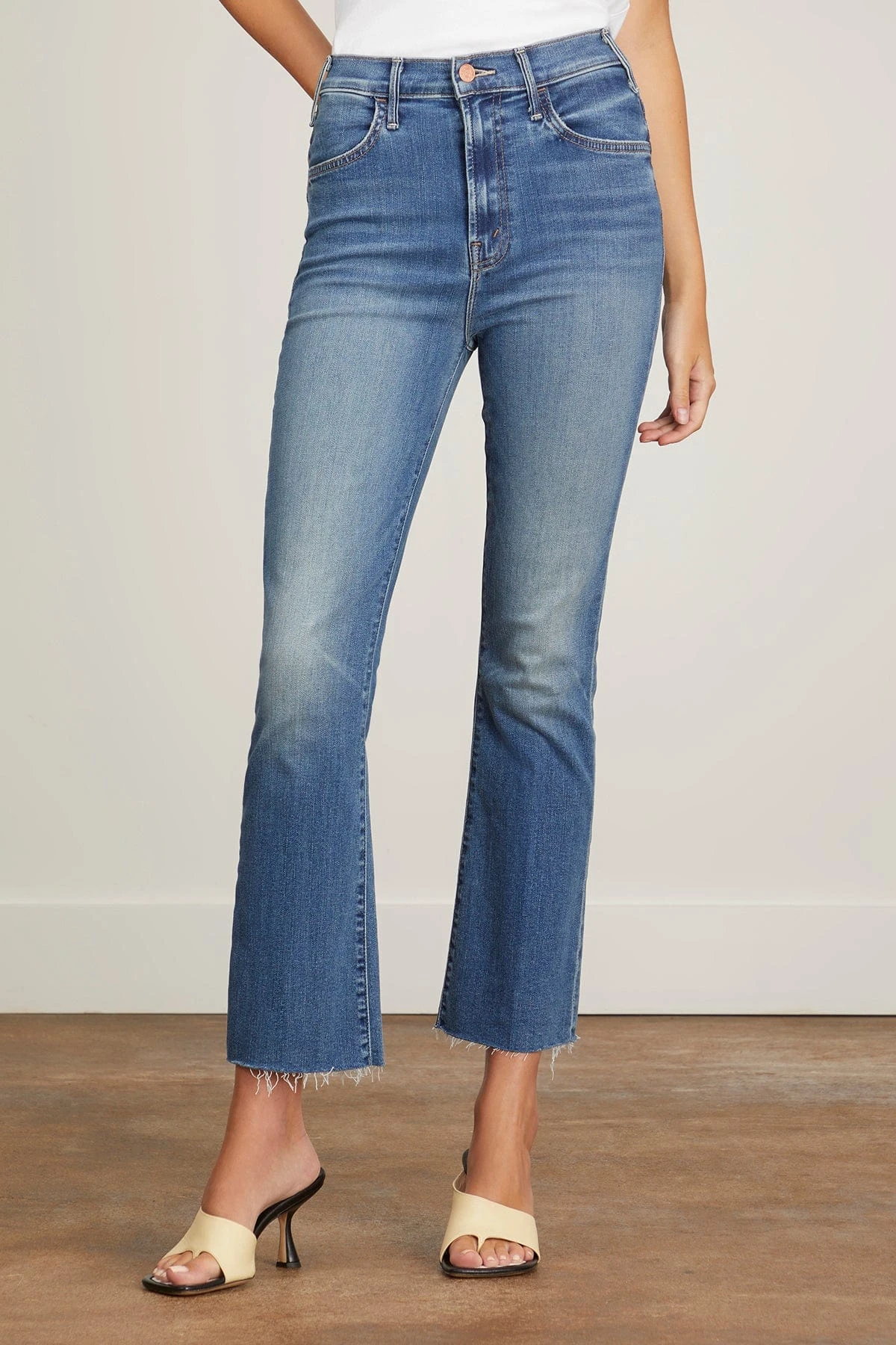 Your favorite jeans are back. The Mother The Hustler Ankle Fray features their signature cropped flare leg in stretch denim with fading. Wear yours with a top tucked in.