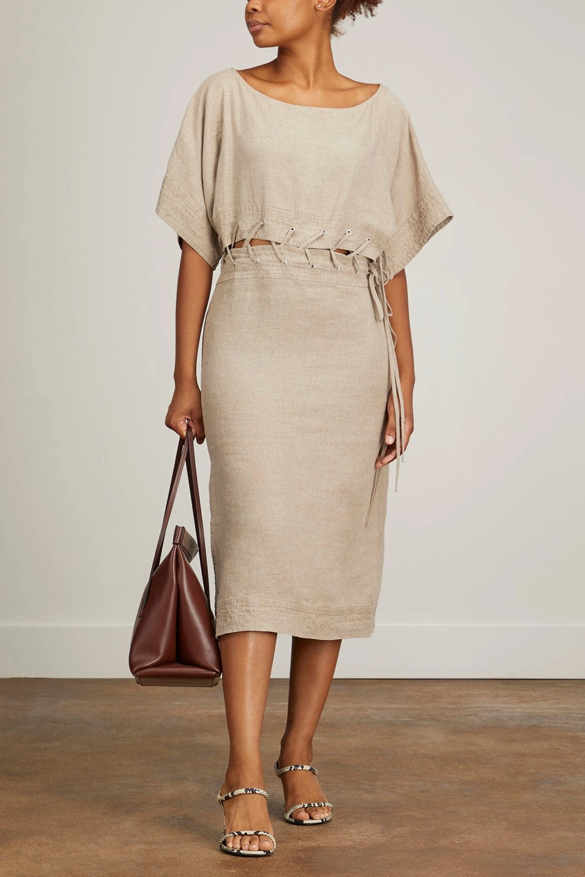 The Rachel Comey Nostrano Dress is a great transitional piece to add to your wardrobe. You’ll love the unique cutout waistline with lacing of this midi linen dress. Wear yours with sandals and a crossbody bag.