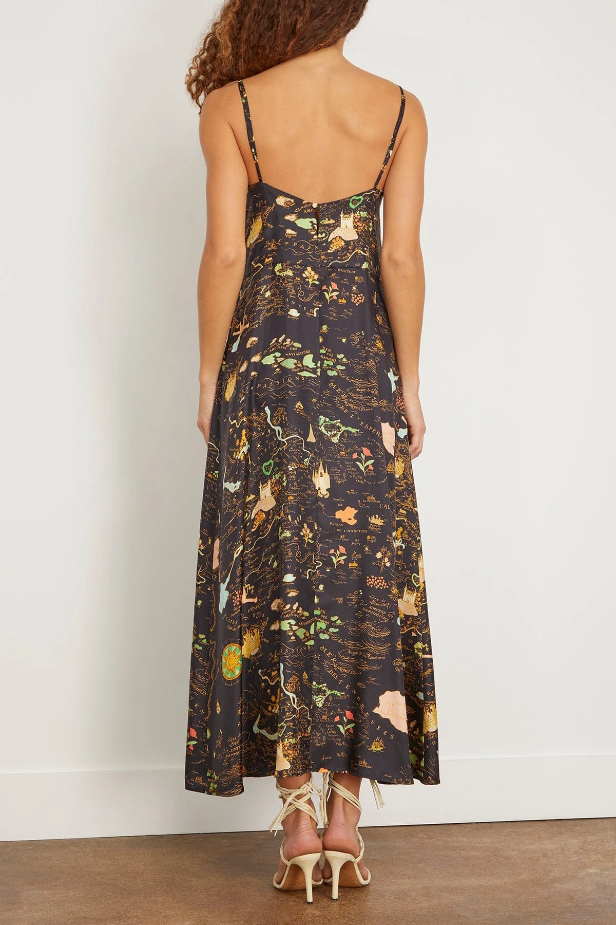 The La Prestic Ouiston Petula Dress is a twist on a classic. This slip dress features a loose silhouette in a bold map inspired print. Wear yours with a sweater and boots this season.