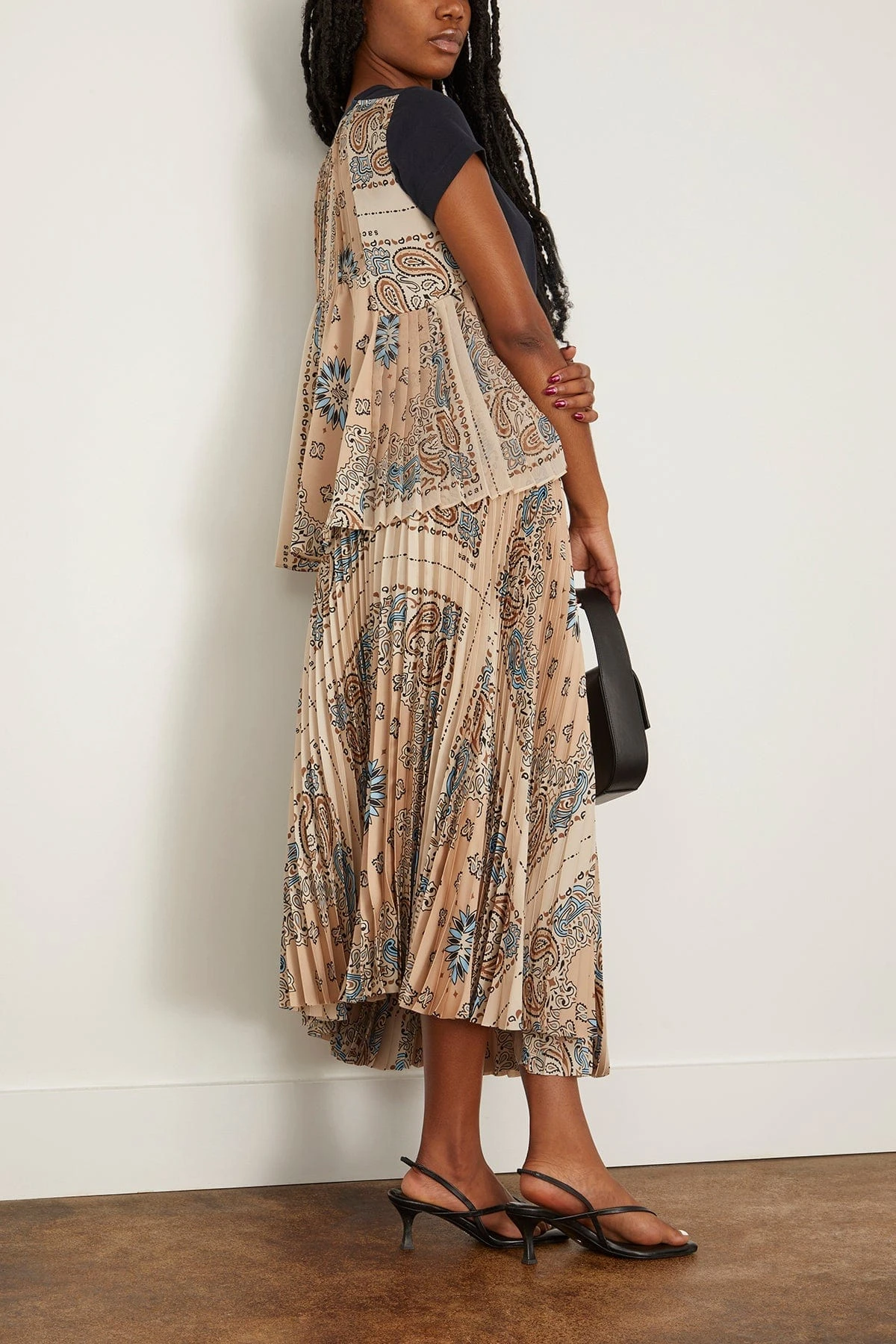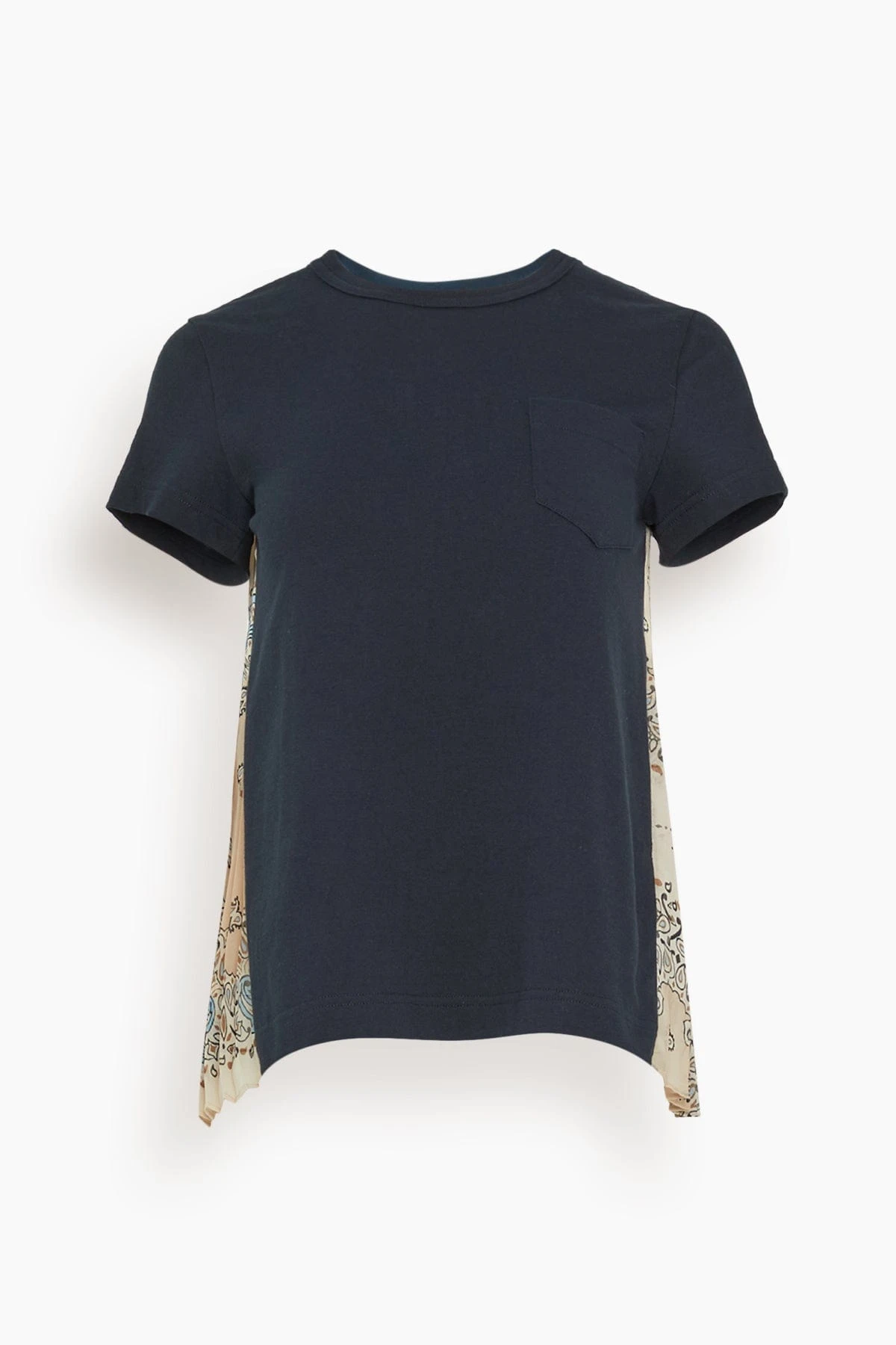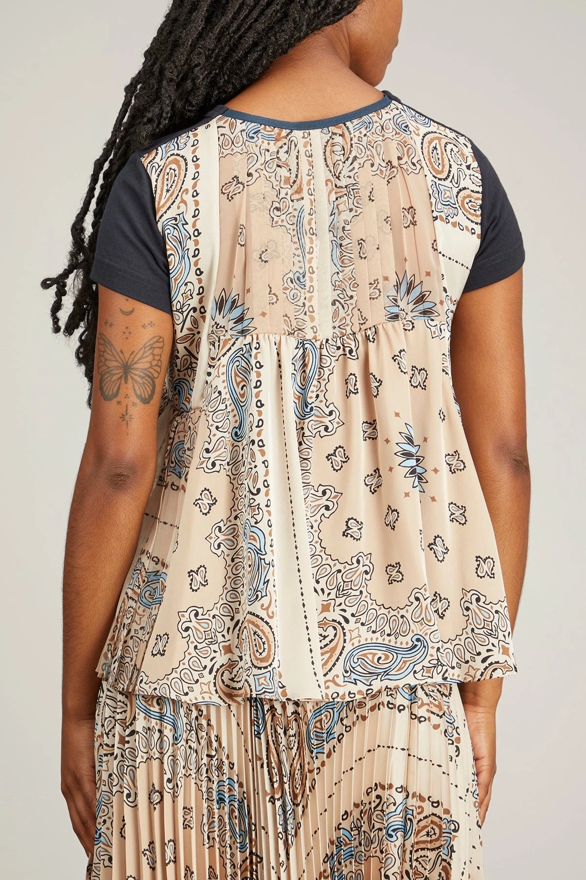 The Sacai Bandana Print T-Shirt is a must-have piece from their PreFall 23 Collection. You’ll love the contrasting bandana printed pleated back of this t-shirt. Wear yours with jeans and boots this season.