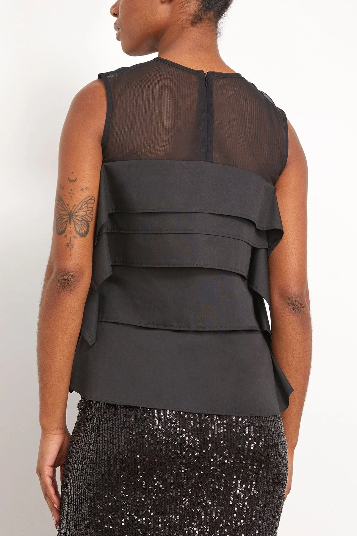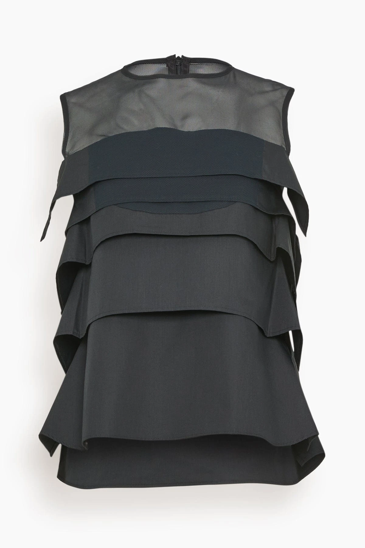 The Sacai Chiffon Mix Cotton Poplin Pullover in Black features a sleeveless design, sheer inset at the neck, and tiered full silhouette. This pullover features the classic Sacai layering technique. We love it worn with jeans and heels.