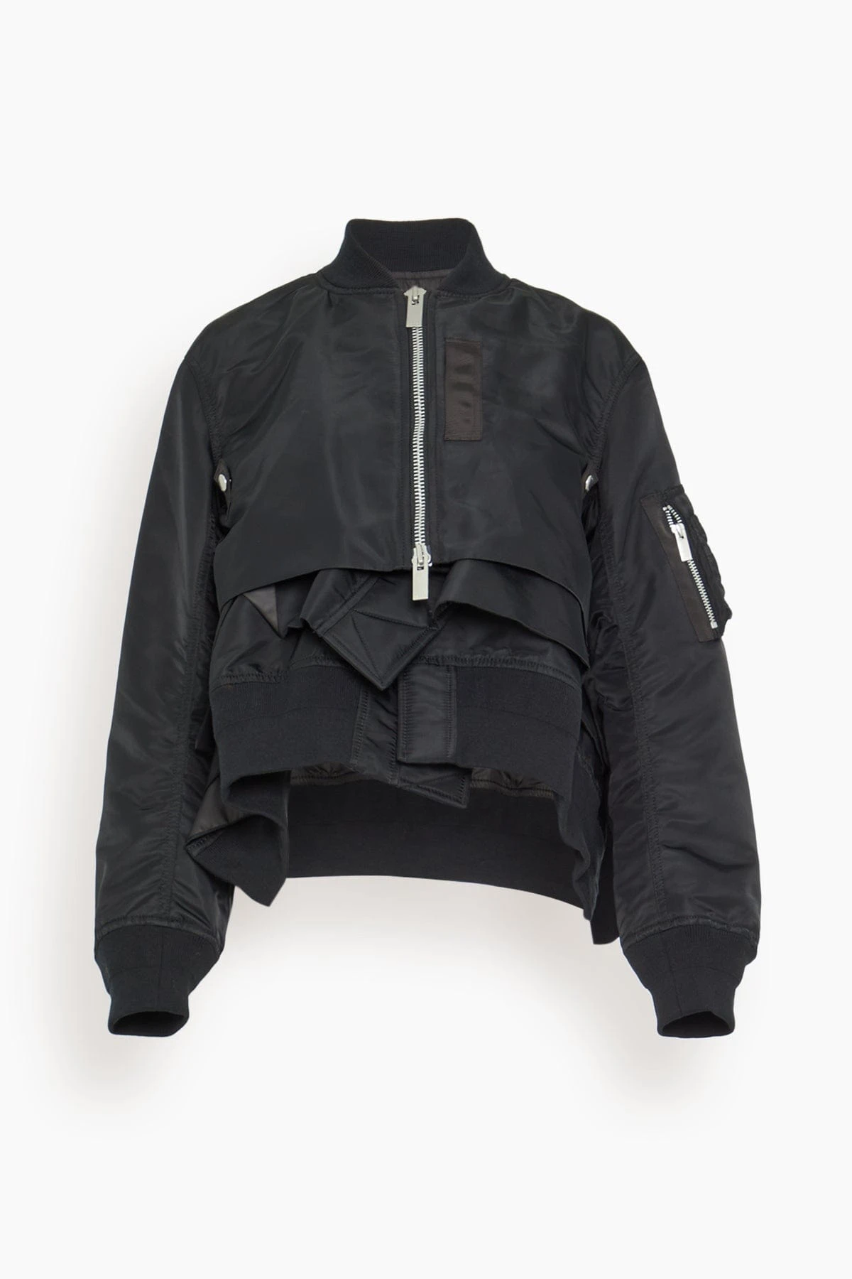 The Sacai Nylon Twill Blouson Jacket in Black is a bomber jacket with unique layering details. This jacket features satin fabric with zip detail and a layered design. We love it paired with a midi skirt and boots.