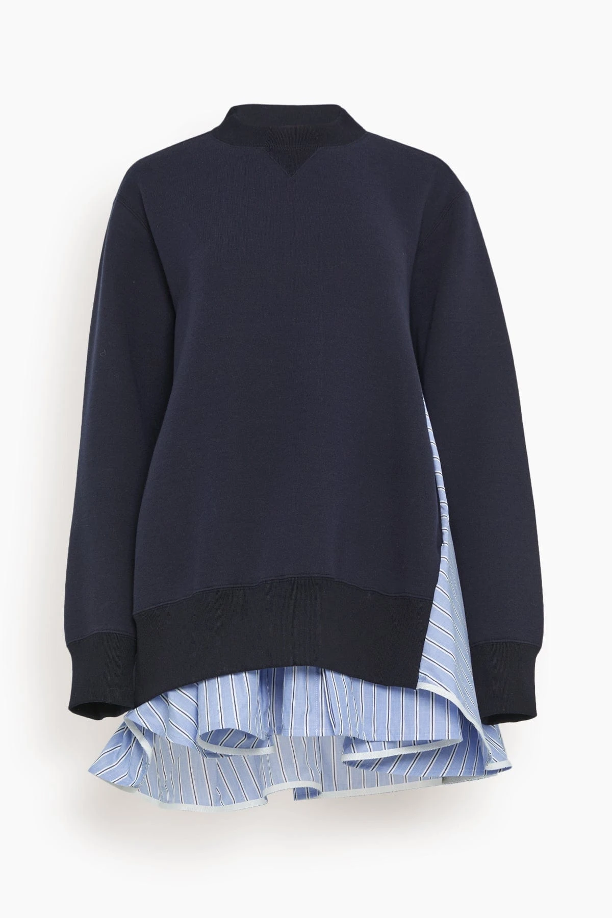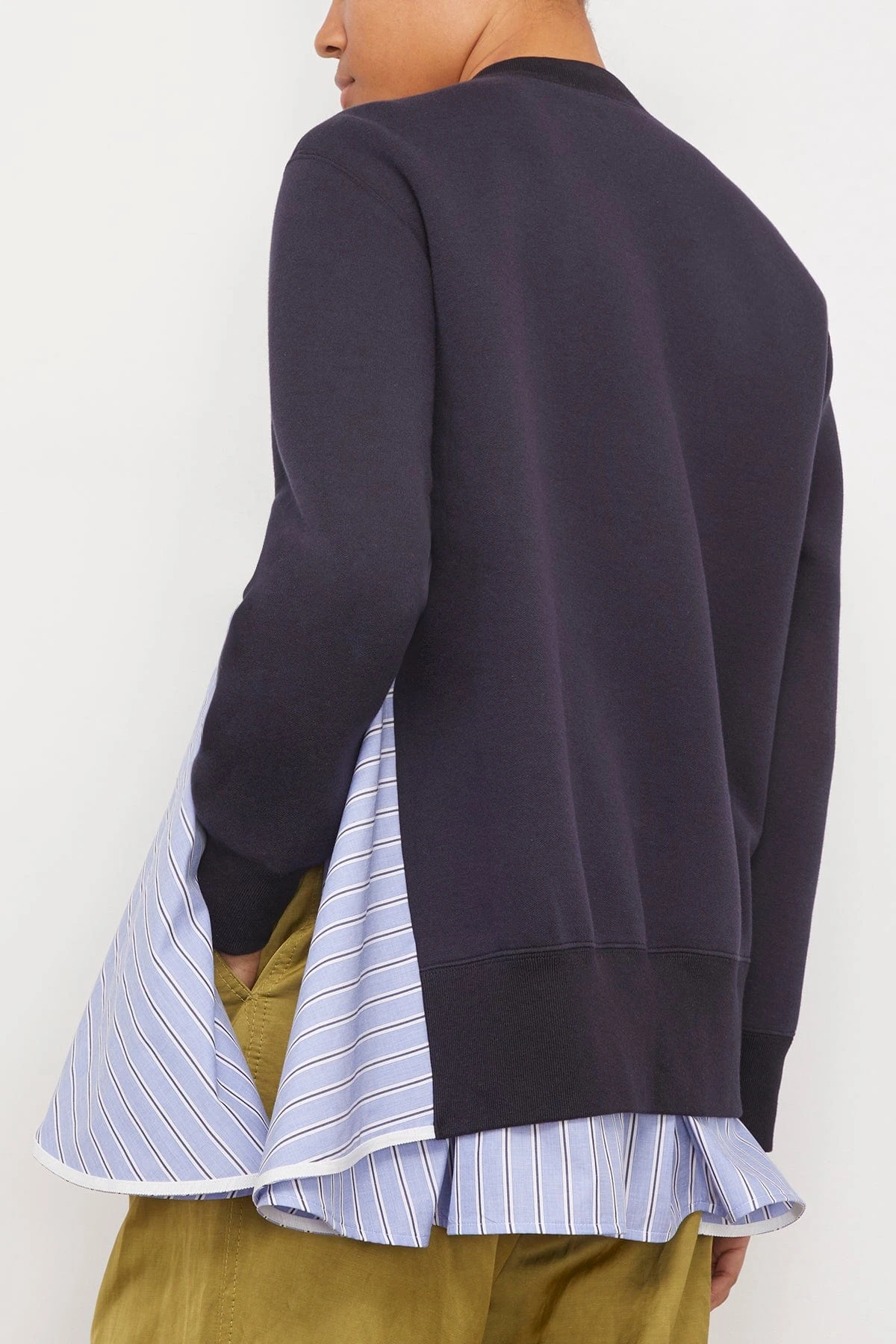 The Sacai Sponge Sweat Pullover in Navy features a layered design with a striped flared underlayer and back panel. This pullover features flared poplin panels inspired by classic shirting. This spongy crewneck sweatshirt rendered in Chitose Abe’s quintessential hybridized style makes this pullover a piece you’ll wear every fall/ winter season.