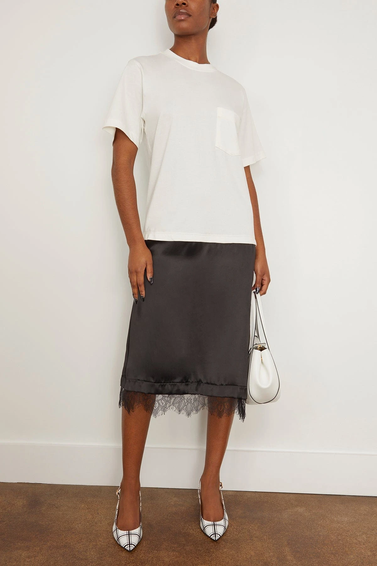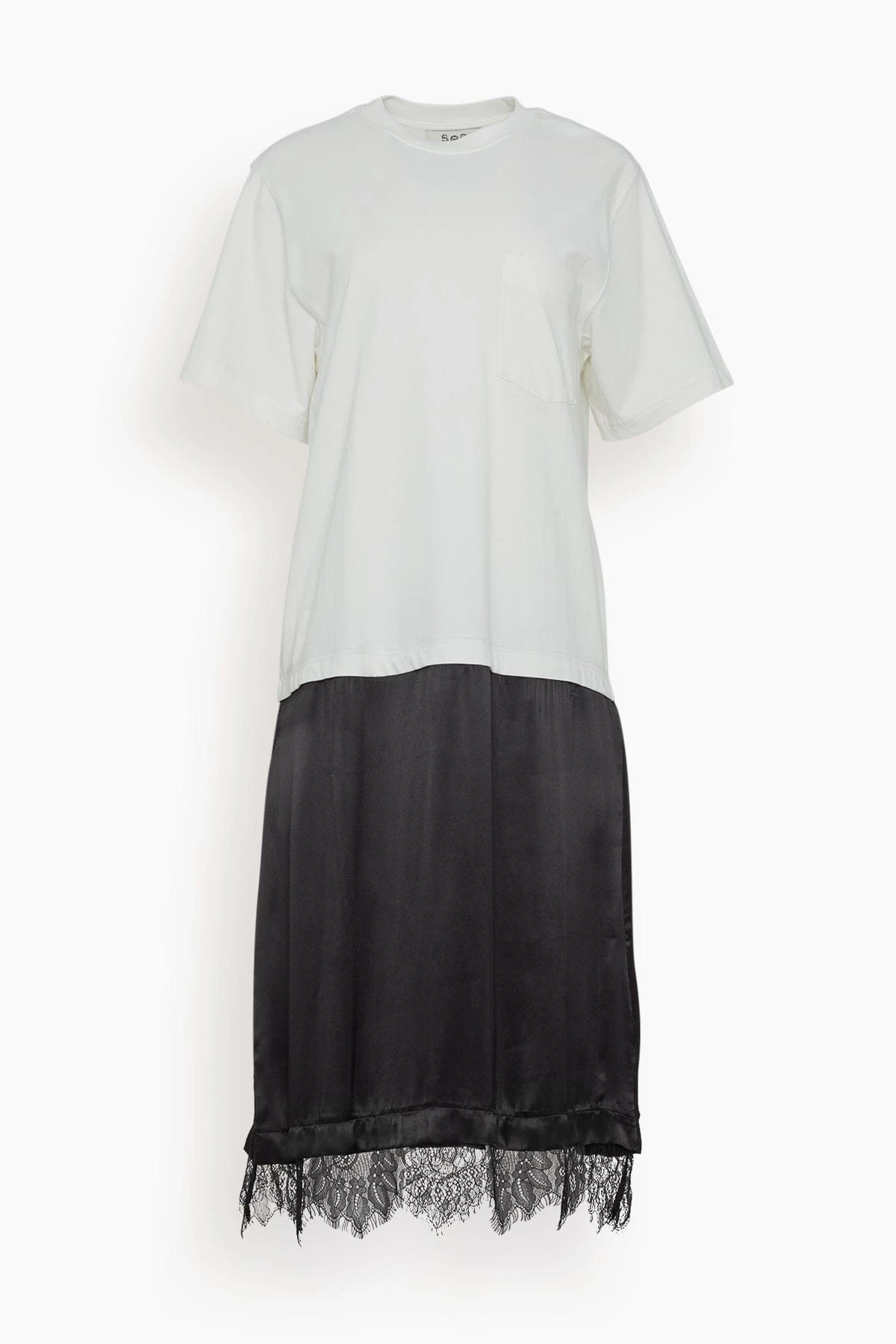 The SEA Lorraine Lace Combo T-Shirt Dress features a mix of feminine and edgy. This t-shirt dress has a lace overlay with a loose silhouette. Wear yours with boots and a shoulder bag.