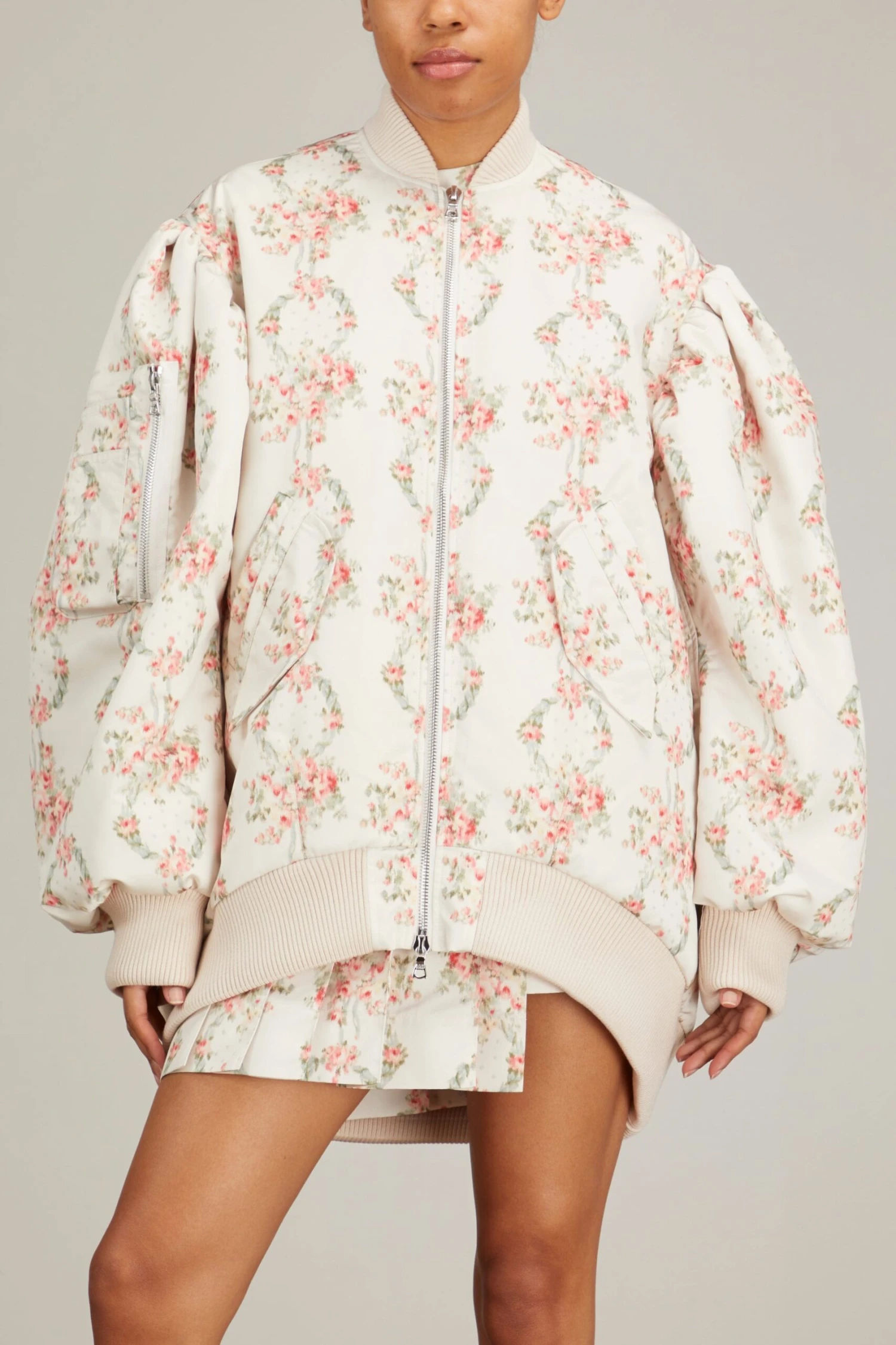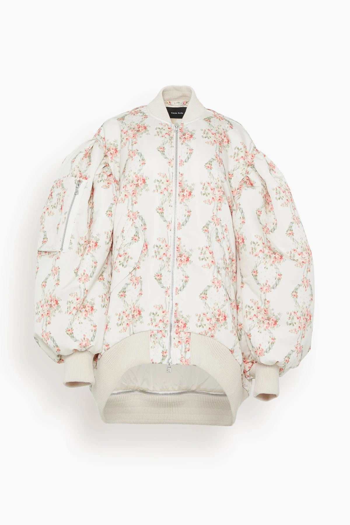 The Simone Rocha Oversized Puff Sleeve Bomber Jacket walked their Spring 23 Runway. This puff bomber jacket features their signature oversized silhouette in their must-have floral print. Wear yours over a dress with loafers.