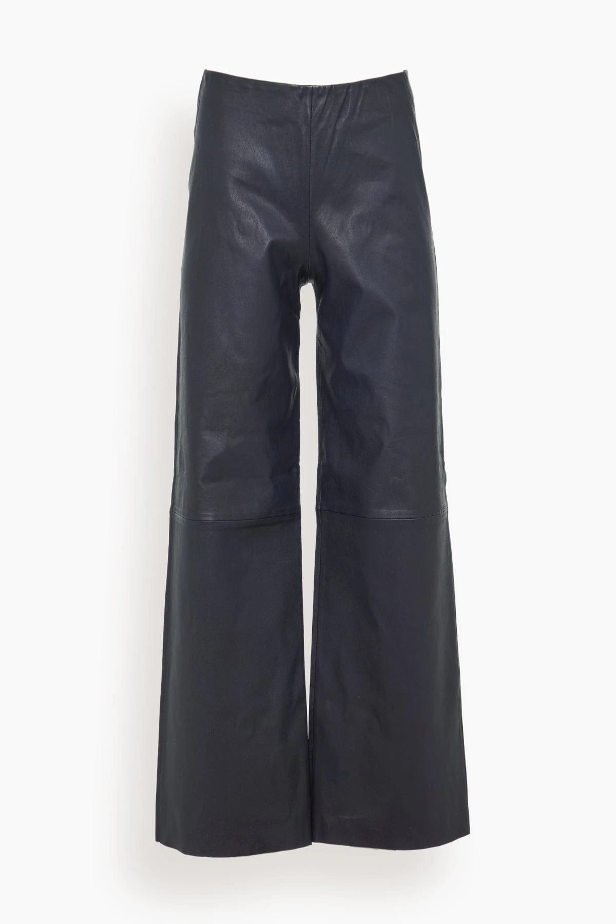 The Odeeh Stretch Nappa Pants in Black/Blue are leather pants with elastic waistband, shortened length, and slightly flared leg.