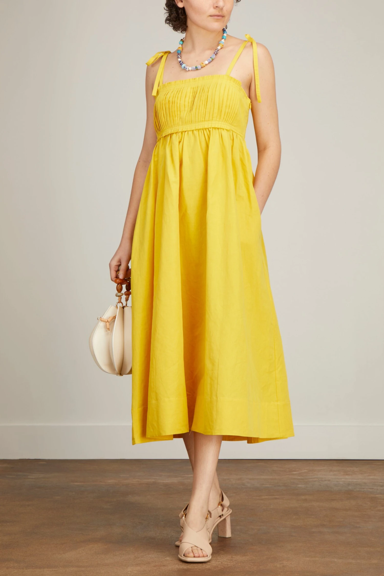 the Ulla Johnson Laetitia Dress will be a staple in your spring and summer wardrobe. This linen blend dress features a flattering empire waistline with a plated bandeau and tie shoulder straps. Wear yours with sandals and a tote bag.