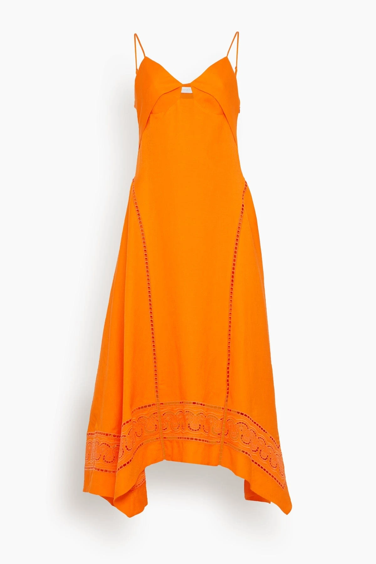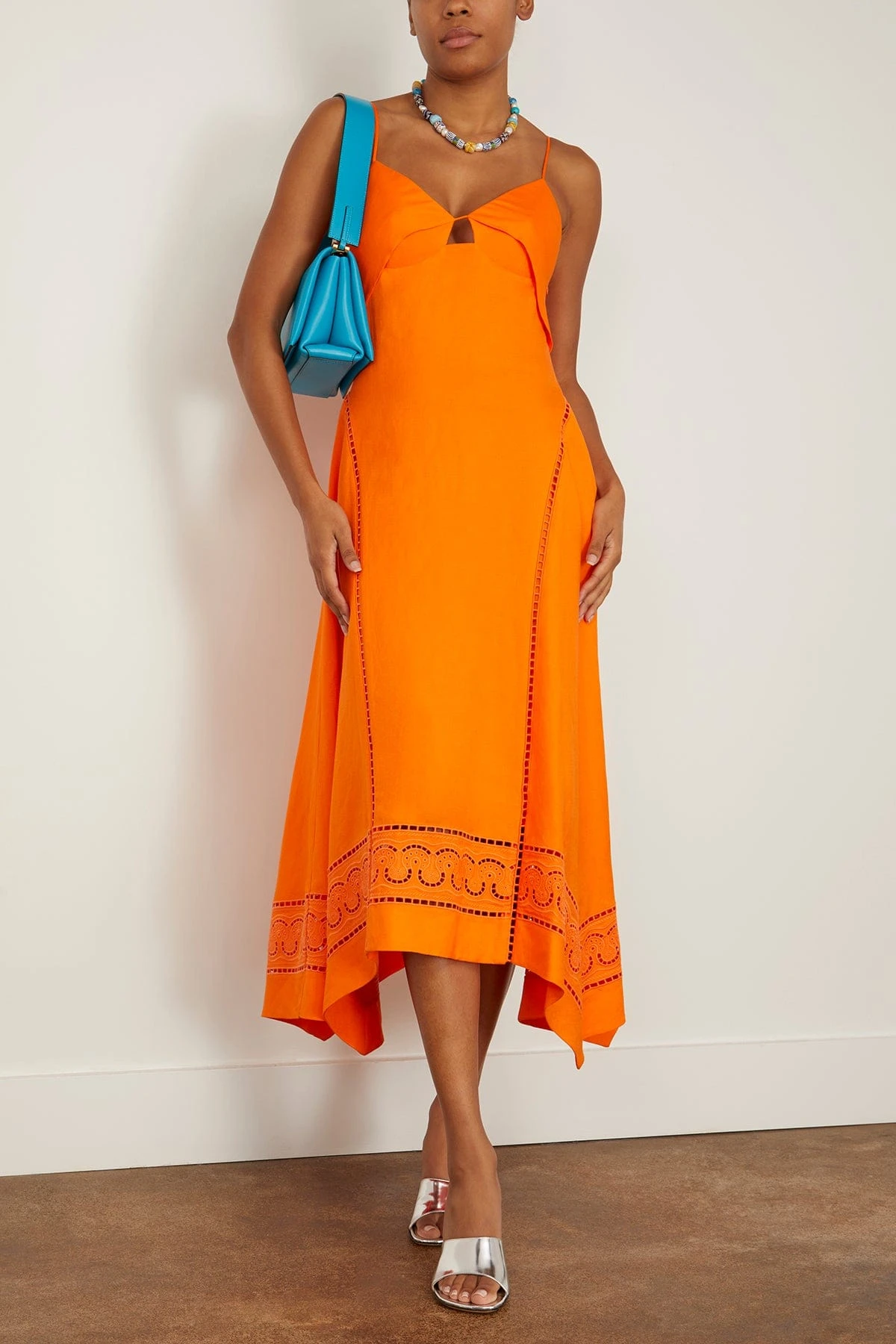 The Simkhai Valeria Scarf Embroidered Handkerchief Midi Dress features beautiful embroidery you’ll love. This midi dress has a handkerchief hemline with a flowing silhouette in a lightweight linen blend.